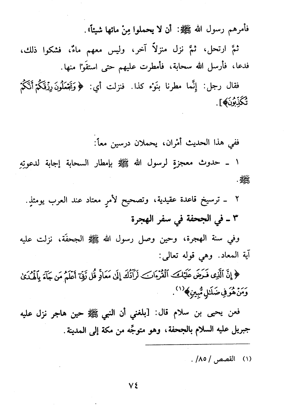 وفي سنة الهجرة، وحين وصل رسول الله صلى الله عليه وسلم الجحفة، نزلت عليه آية المعاد. وهي قوله تعالى: