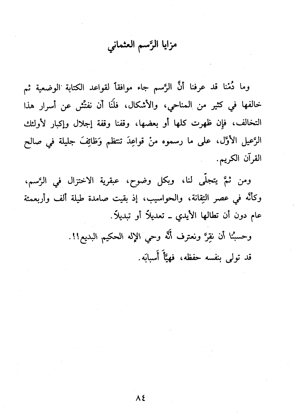 ومن ثمّ يتجلّى لنا، وبكل وضوح، عبقرية الاختزال في الرّسم، وكأنّه في عصر التقانة، والحواسيب، إذ بقيت صامدة طيلة ألف وأربعمائة عام دون أن تطالها الأيدي- تعديلا أو تبديلا.