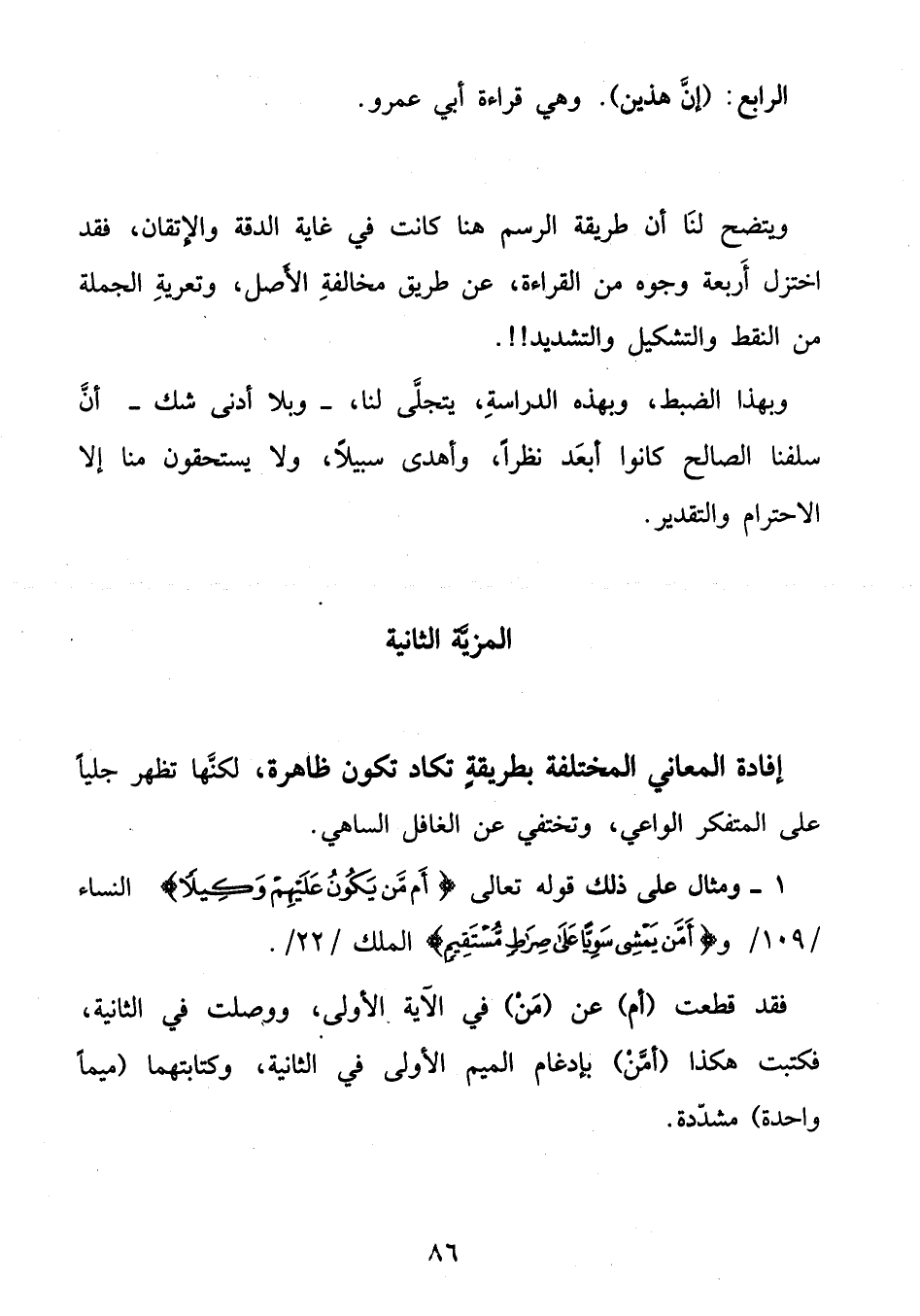 فقد قطعت (أم) عن (من) في الآية الأولى، ووصلت في الثانية، فكتبت هكذا (أمّن) بإدغام الميم الأولى في الثانية، وكتابتهما (ميما واحدة) مشدّدة.