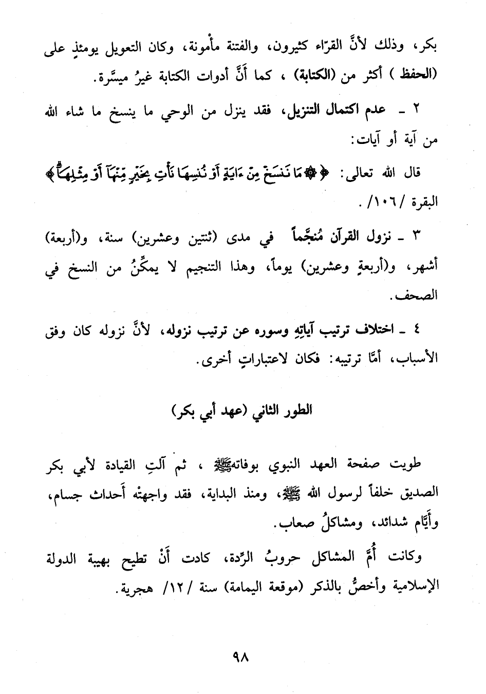 بكر، وذلك لأنّ القرّاء كثيرون، والفتنة مأمونة، وكان التعويل يومئذ على (الحفظ) أكثر من (الكتابة)، كما أنّ أدوات الكتابة غير ميسّرة.