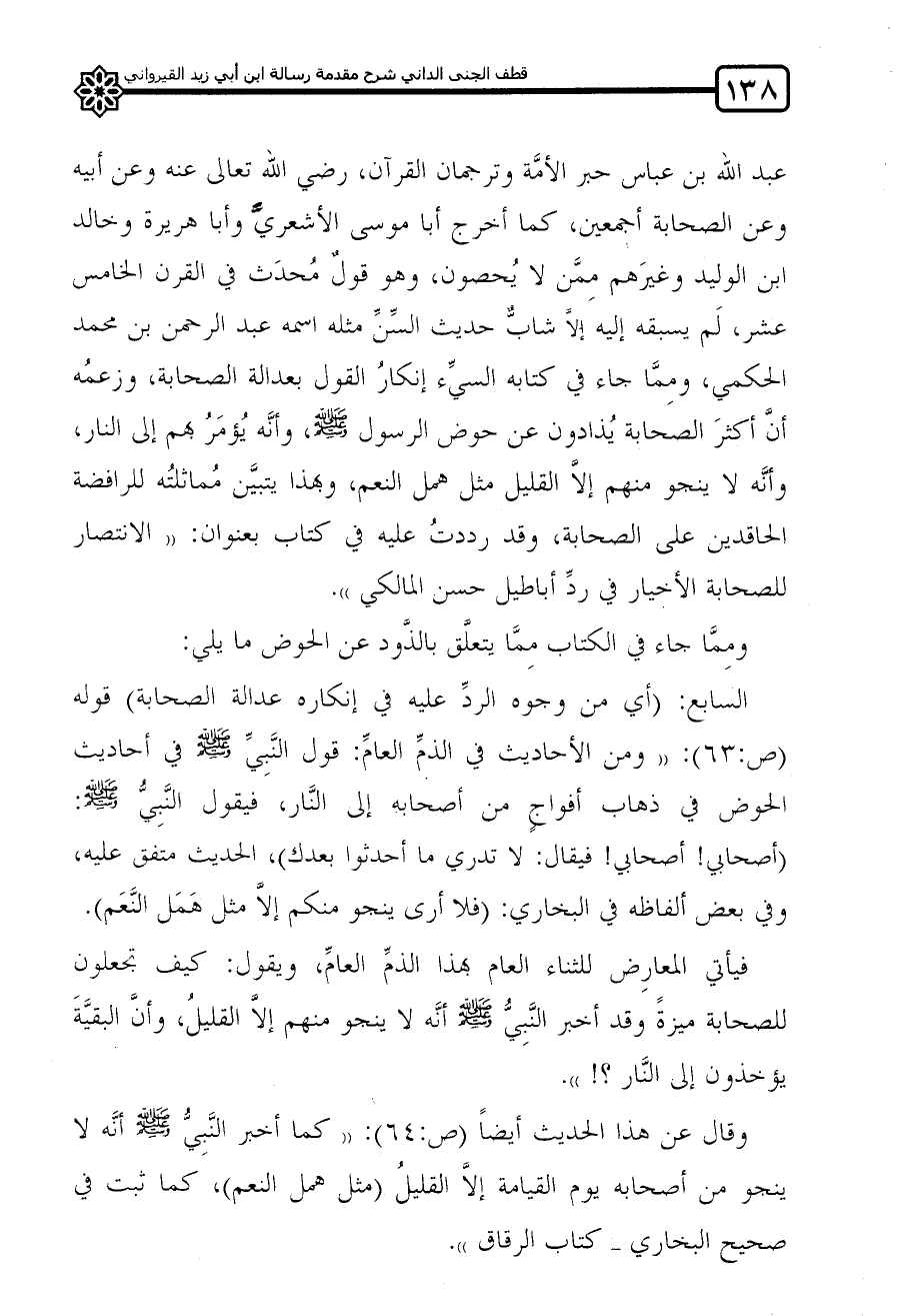 عبد الله بن عباس حبر الأمَّة وترجمان القرآن، رضي الله تعالى عنه وعن أبيه وعن الصحابة أجمعين، كما أخرج أبا موسى الأشعريِّ وأبا هريرة وخالد ابن الوليد وغيرَهم مِمَّن لا يُحصون، وهو قولٌ مُحدَث في القرن الخامس عشر، لَم يسبقه إليه إلاَّ شابٌّ حديث السِّنِّ مثله اسمه عبد الرحمن بن محمد الحكمي، ومِمَّا جاء في كتابه السيِّء إنكارُ القول بعدالة الصحابة، وزعمُه أنَّ أكثرَ الصحابة يُذادون عن حوض الرسول صلى الله عليه وسلم، وأنَّه يُؤمَرُ بهم إلى النار، وأنَّه لا ينجو منهم إلاَّ القليل مثل همل النعم، وبهذا يتبيَّن مُماثلتُه للرافضة الحاقدين على الصحابة، وقد رددتُ عليه في كتاب بعنوان: "الانتصار للصحابة الأخيار في ردِّ أباطيل حسن المالكي".
