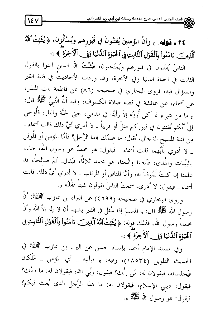 24 قوله: "وأنَّ المؤمنِينَ يُفْتَنُونَ في قُبُورِهم ويُسْأَلُون، {يُثَبِّتُ اللَّهُ الَّذِينَ آمَنُوا بِالْقَوْلِ الثَّابِتِ فِي الْحَيَاةِ الدُّنْيَا وَفِي الْآخِرَةِ} ".