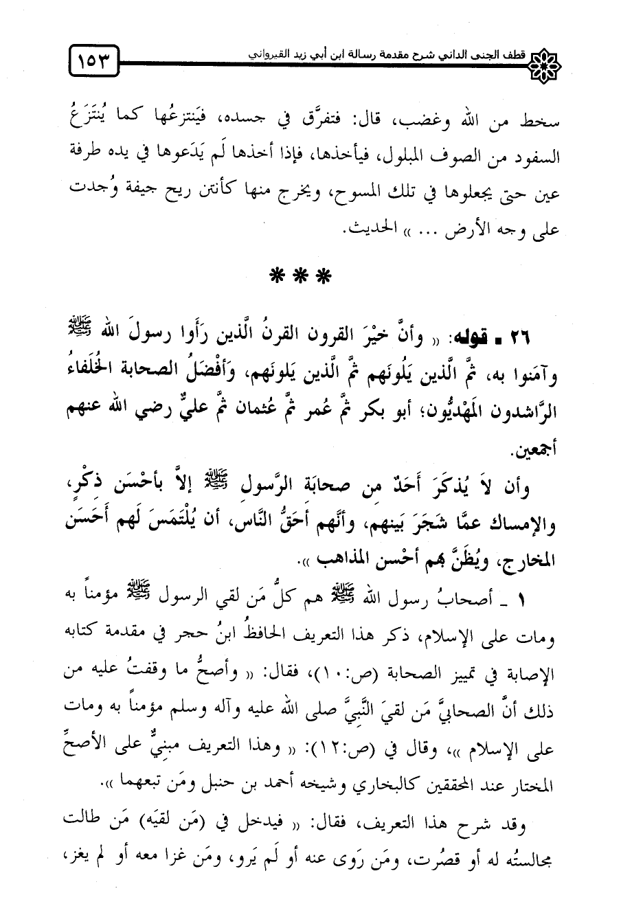26 قوله: "وأنَّ خيْرَ القرون القرنُ الَّذين رَأَوا رسولَ الله صلى الله عليه وسلم وآمَنوا به، ثمَّ الَّذين يَلُونَهم ثمَّ الَّذين يَلونَهم، وَأفْضَلُ الصحابة الخُلَفاءُ الرَّاشدون المَهْديُّون؛ أبو بكر ثمَّ عُمر ثمَّ عُثمان ثمَّ عليٌّ رضي الله عنهم أجمعين.