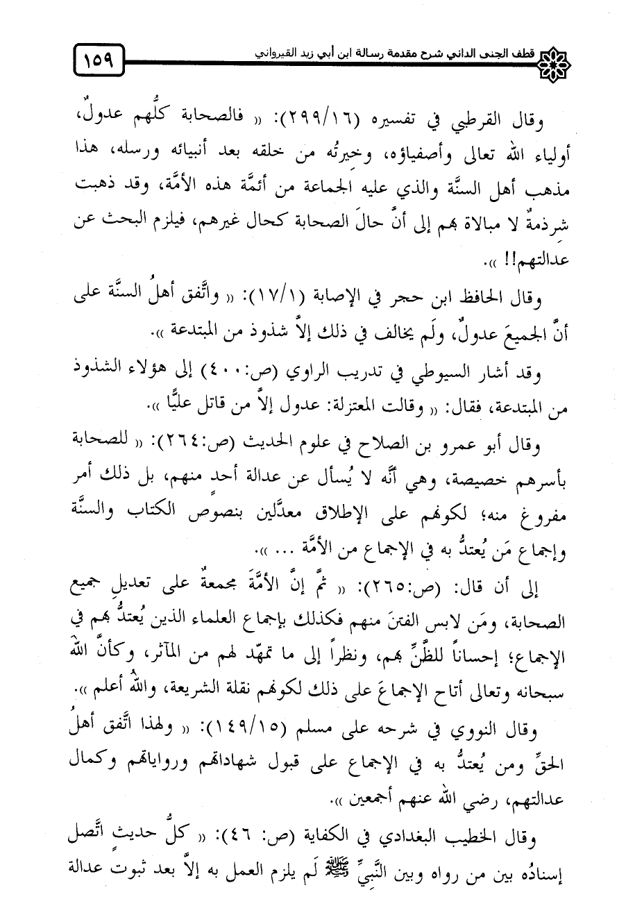 وقال القرطبي في تفسيره (16/299) : "فالصحابة كلُّهم عدولٌ، أولياء الله تعالى وأصفياؤه، وخِيرتُه من خلقه بعد أنبيائه ورسله، هذا مذهب أهل السنَّة والذي عليه الجماعة من أئمَّة هذه الأمَّة، وقد ذهبت شِرذمةٌ لا مبالاة بهم إلى أنَّ حالَ الصحابة كحال غيرهم، فيلزم البحث عن عدالتهم!! ".