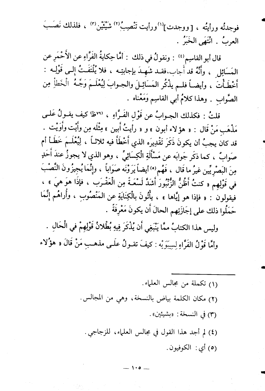 قلت: فَكَذَلِك الْجَواب عَن قَول الْفراء، كَيفَ يَقُول على مَذْهَب من قَالَ: " هَؤُلَاءِ أبون " و " رَأَيْت أبين " مثله من وأيت وأويت. قد كَانَ يجب أَن يكون ذكر تَقْدِيره الَّذِي أَخطَأ فِيهِ ثَلَاثًا، ليُعلم خطأ أم صَوَاب، كَمَا ذكر جَوَابه عَن مَسْأَلَة الْكسَائي، وَهُوَ الَّذِي لَا يجوز عِنْد أحد من الْبَصرِيين غير مَا قَالَ، فهم أَيْضا يرونه صَوَابا، وَإِنَّمَا يجيزن النصب فِي قَوْلهم " كنت أَظن الزنبور أَشد لسعة من الْعَقْرَب، فَإِذا هُوَ هِيَ "، فَيَقُولُونَ: " فَإِذا هُوَ إِيَّاهَا "، يأْتونَ بِالْكِنَايَةِ عَن الْمَنْصُوب، وأراهم إِنَّمَا حملُوا ذَلِك على إجازتهم الْحَال أَن يكون معرفَة.