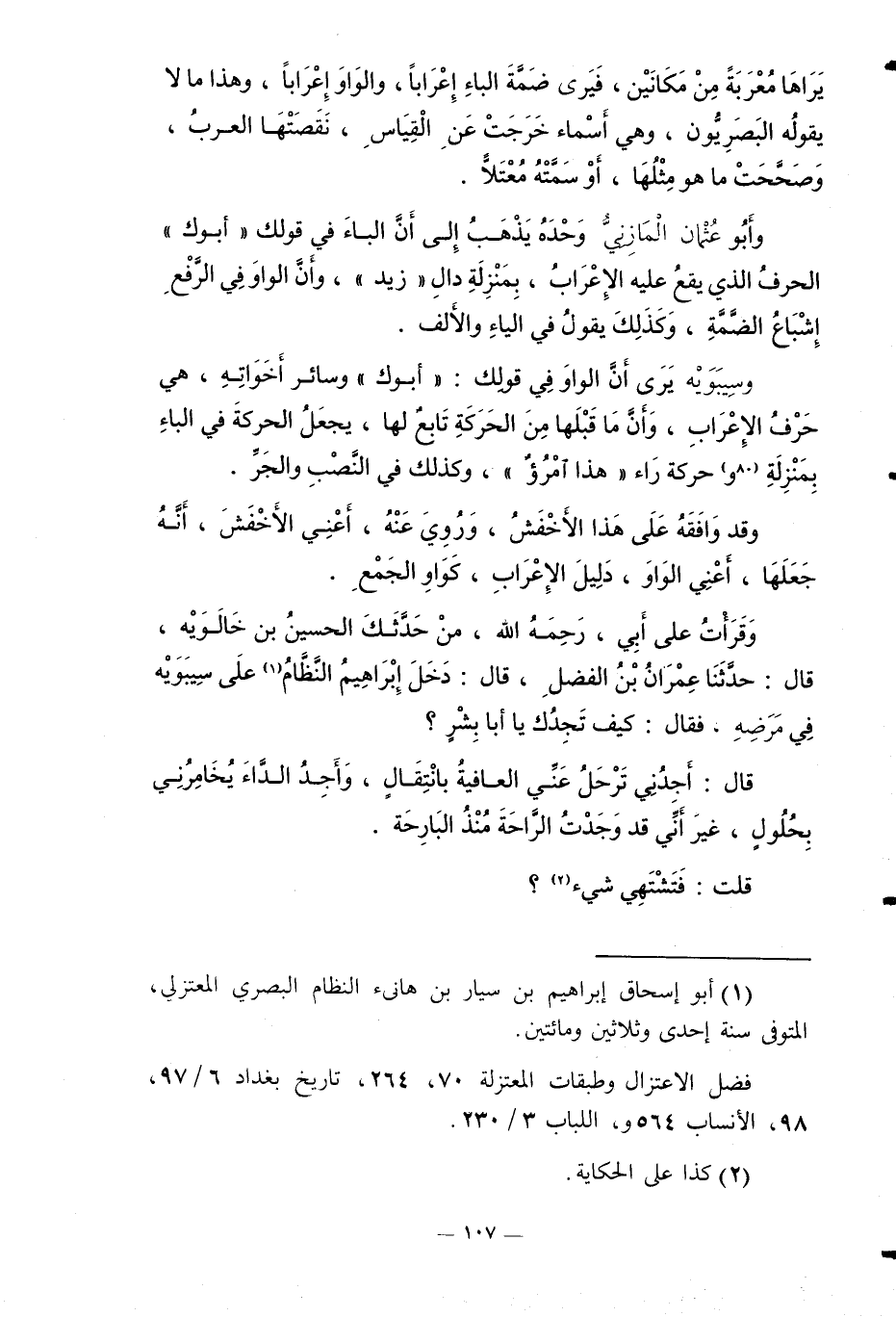 وقرأت على أبي، رَحمَه الله، من حَدثَك الْحُسَيْن بن خالويه، قَالَ: حدَّثنا عمرَان بن الْفضل، قَالَ: دخل إِبْرَاهِيم النظام على سِيبَوَيْهٍ فِي مَرضه، فَقَالَ: كَيفَ تجدك يَا أَبَا بشر؟ قَالَ: أجدني ترحل عني الْعَافِيَة بانتقال، وَأَجد الدَّاء يخامرني بحلول، غير أَنِّي قد وجدت الرَّاحَة مُنْذُ البارحة.