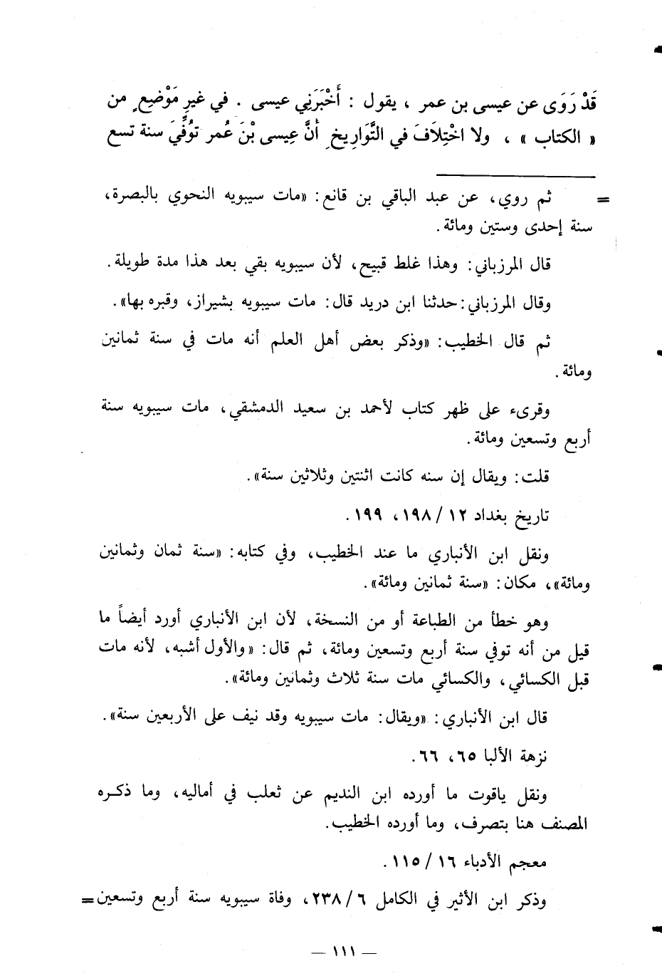 قد روى عَن عِيسَى بن عمر، يَقُول: أَخْبرنِي عِيسَى. فِي غير مَوضِع من " الْكتاب "، وَلَا اخْتِلَاف فِي التواريخ أَن عِيسَى بن عمر تُوفي سنة تسع