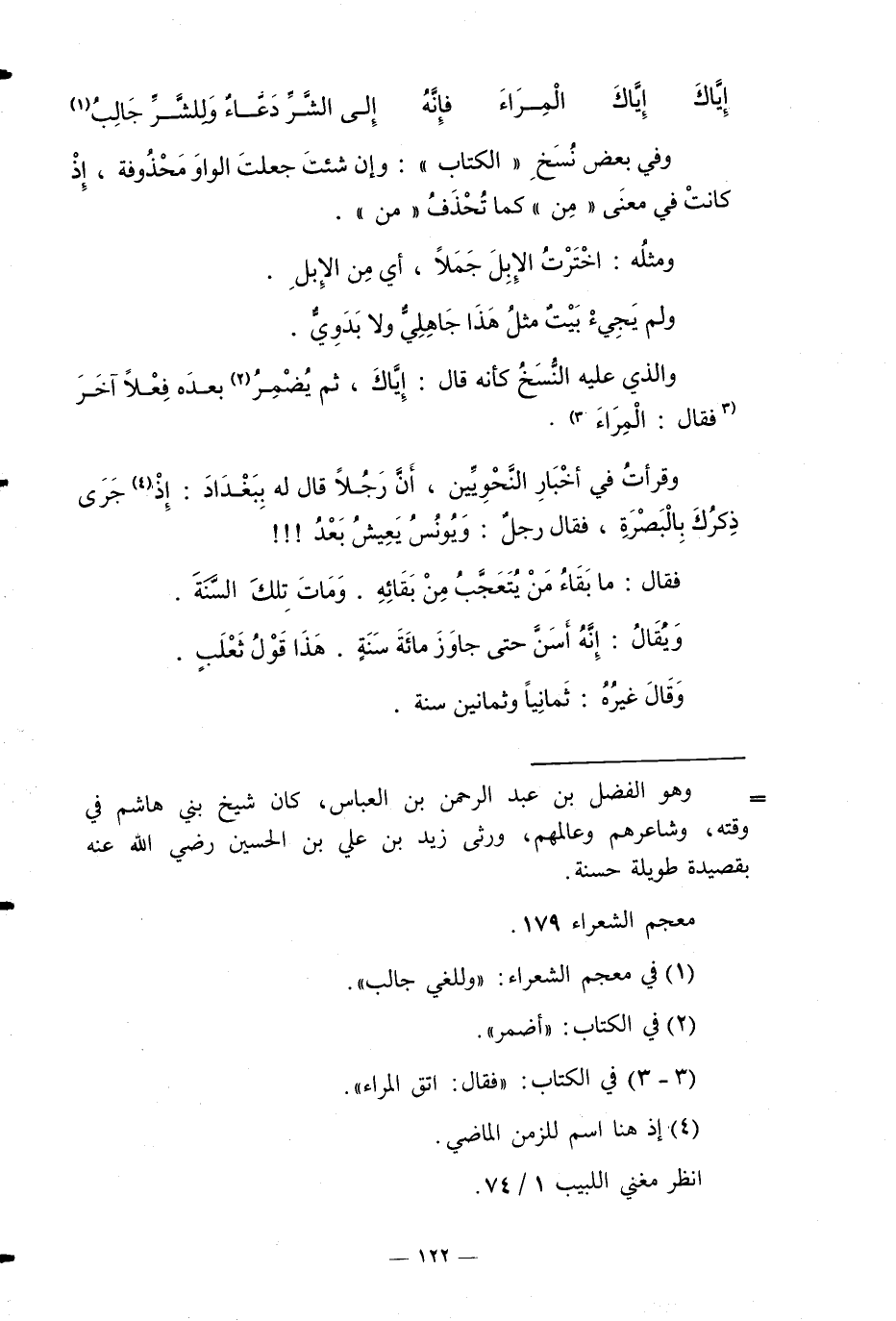 إِيَّاكَ إِيَّاكَ الْمِرَاءَ فإِنَّهُ ... إِلَى الشَّرِّ دَعَاءٌ ولِلشَّرِّ جَالِبُ