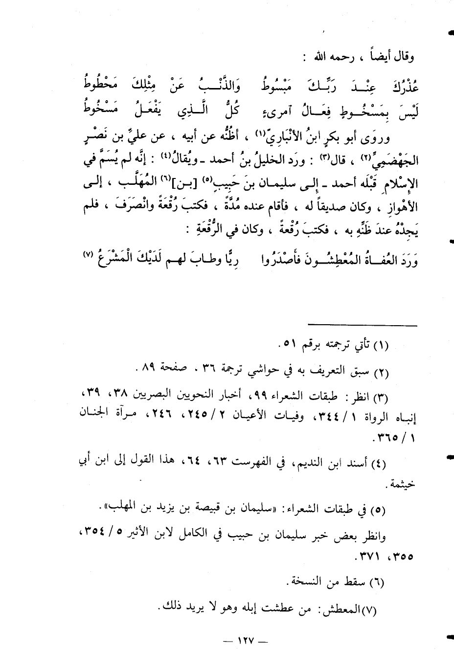 وروى أَبُو بكر ابْن الْأَنْبَارِي، أَظُنهُ عَن أَبِيه، عَن عَليّ بن نصر الْجَهْضَمِي، قَالَ: ورد الْخَلِيل بن أَحْمد - وَيُقَال: إِنَّه لم يسم فِي الْإِسْلَام قبله أَحْمد - إِلَى سُلَيْمَان بن حبيب بن الْمُهلب، إِلَى الأهواز، وَكَانَ صديقا لَهُ، فَأَقَامَ عِنْده مدَّة، فَكتب رقْعَة وَانْصَرف، فَلم يجده عِنْد ظَنّه بِهِ، فَكتب رقْعَة، وَكَانَ فِي الرقعة: