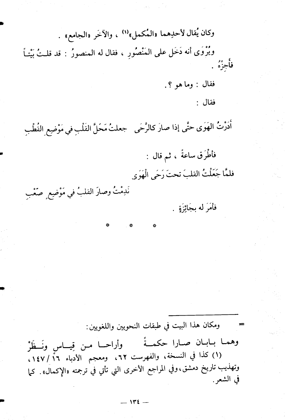 ويروى أَنه دخل على الْمَنْصُور، فَقَالَ لَهُ الْمَنْصُور: قد قلتُ بَيْتا فأجزه.