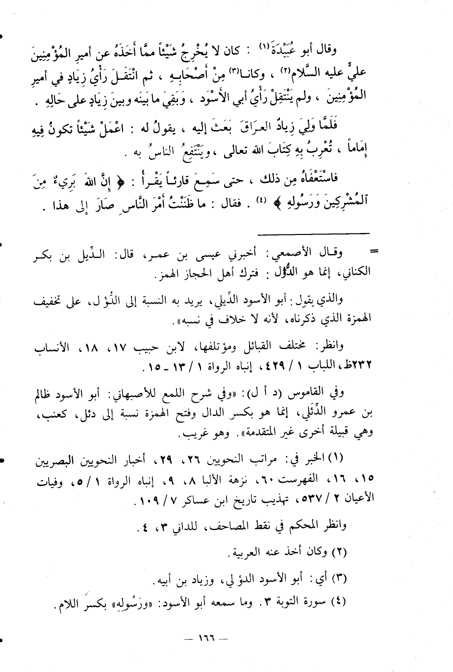 وَقَالَ أَبُو عُبَيْدَة: كَانَ لَا يخرج شَيْئا مِمَّا أَخذه عَن أَمِير الْمُؤمنِينَ عَليّ عَلَيْهِ السَّلَام، وَكَانَا من أَصْحَابه، ثمَّ انْتقل رَأْي زِيَاد فِي أَمِير الْمُؤمنِينَ، وَلم ينْتَقل رَأْي أبي الْأسود، وَبَقِي مَا بَينه وَبَين زِيَاد على حَاله.