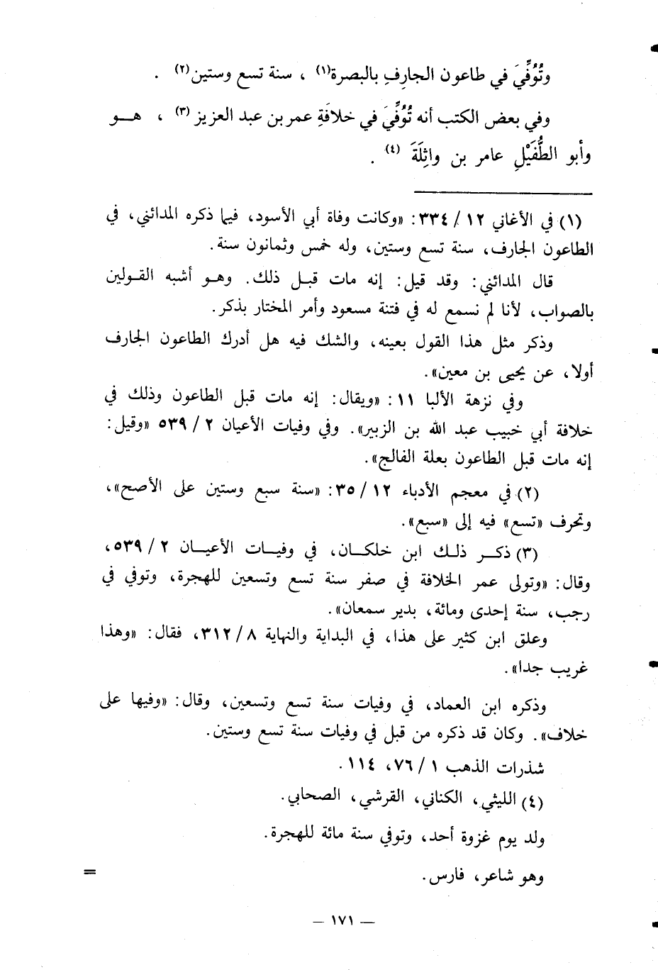 وَفِي بعض الْكتب أَنه تُوفي فِي خلَافَة عمر بن عبد الْعَزِيز، هُوَ وَأَبُو طفيل عَامر بن وَاثِلَة.
