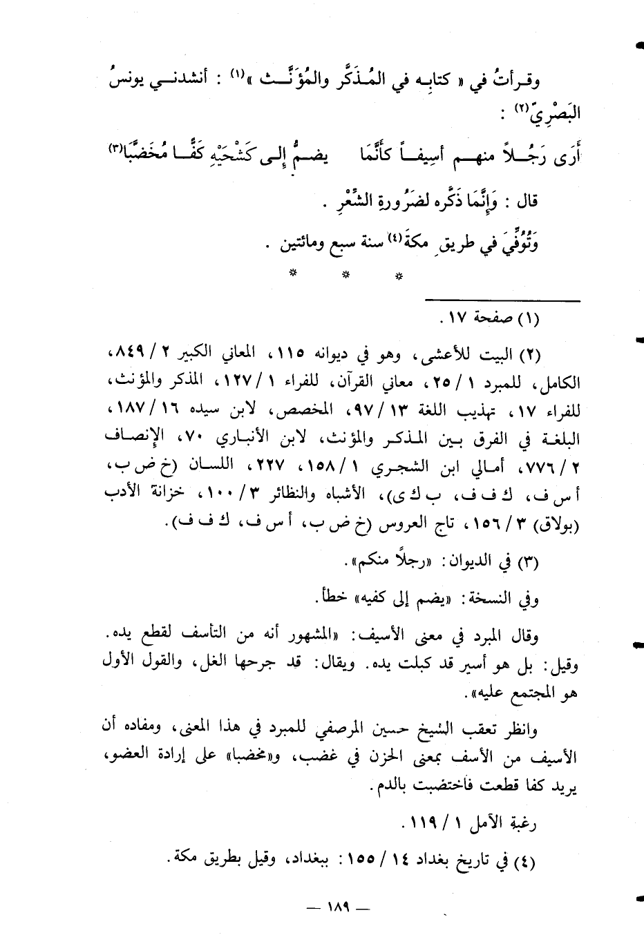 وقرأت فِي " كِتَابه فِي الْمُذكر والمؤنث ": أَنْشدني يُونُس الْبَصْرِيّ: