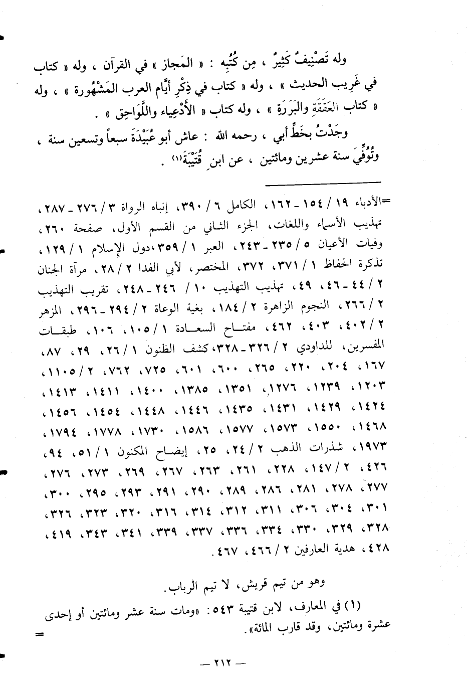 وجدت بِخَط أبي، رَحمَه الله: عَاشَ أَبُو عُبَيْدَة سبعا وَتِسْعين سنة، وتُوفي سنة عشْرين وَمِائَتَيْنِ، عَن ابْن قُتيبة.
