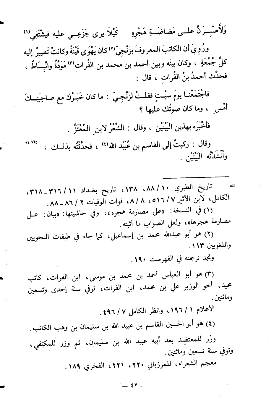 ورُوي أَن الْكَاتِب الْمَعْرُوف بِزَنْجيّ كَانَ يهوى قينة وَكَانَت تصير إِلَيْهِ كل جُمُعَة، وَكَانَ بَينه وَبَين أَحْمد بن مُحَمَّد بن الْفُرَات مَوَدَّة وانبساط، فحدَّث أَحْمد بن الْفُرَات، قَالَ: