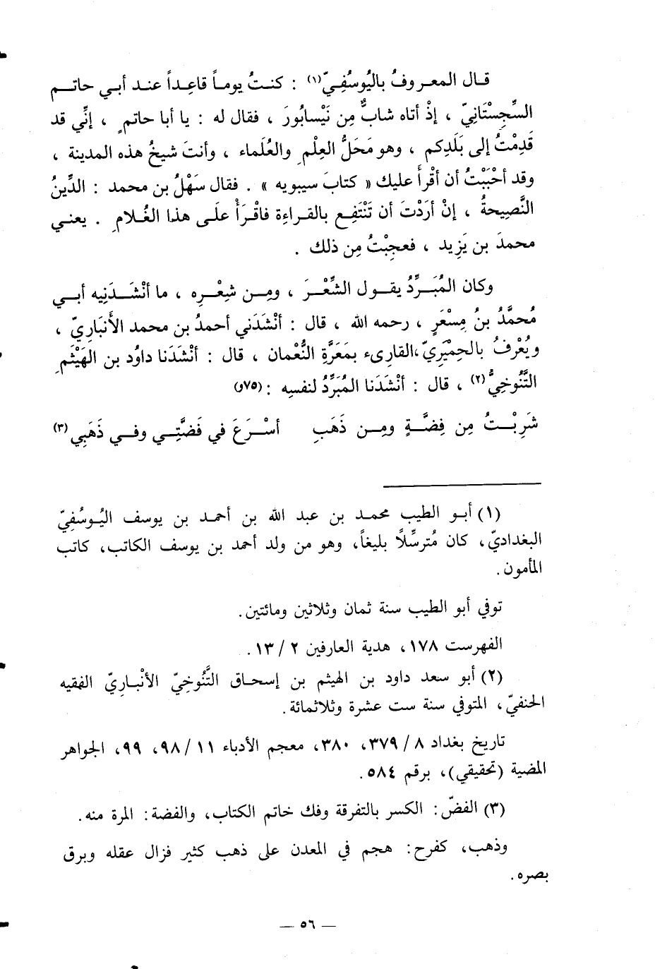 قَالَ الْمَعْرُوف باليوسفي: كنت يَوْمًا قَاعِدا عِنْد أبي حَاتِم السجسْتانِي، إِذْ أَتَاهُ شَاب من نيسابور، فَقَالَ لَهُ: يَا أَبَا حَاتِم، إِنِّي قد قدمت إِلَى بلدكم، وَهُوَ مَحل الْعلم وَالْعُلَمَاء، وَأَنت شيخ هَذِه الْمَدِينَة، وَقد أَحْبَبْت أَن أَقرَأ عَلَيْك " كتاب سِيبَوَيْهٍ ". فَقَالَ سهل بن مُحَمَّد: الدَّين النَّصِيحَة، إِن أردْت أَن تنْتَفع بِالْقِرَاءَةِ فاقرأ على هَذَا الْغُلَام. يَعْنِي مُحَمَّد بن يزِيد، فعجبت من ذَلِك.