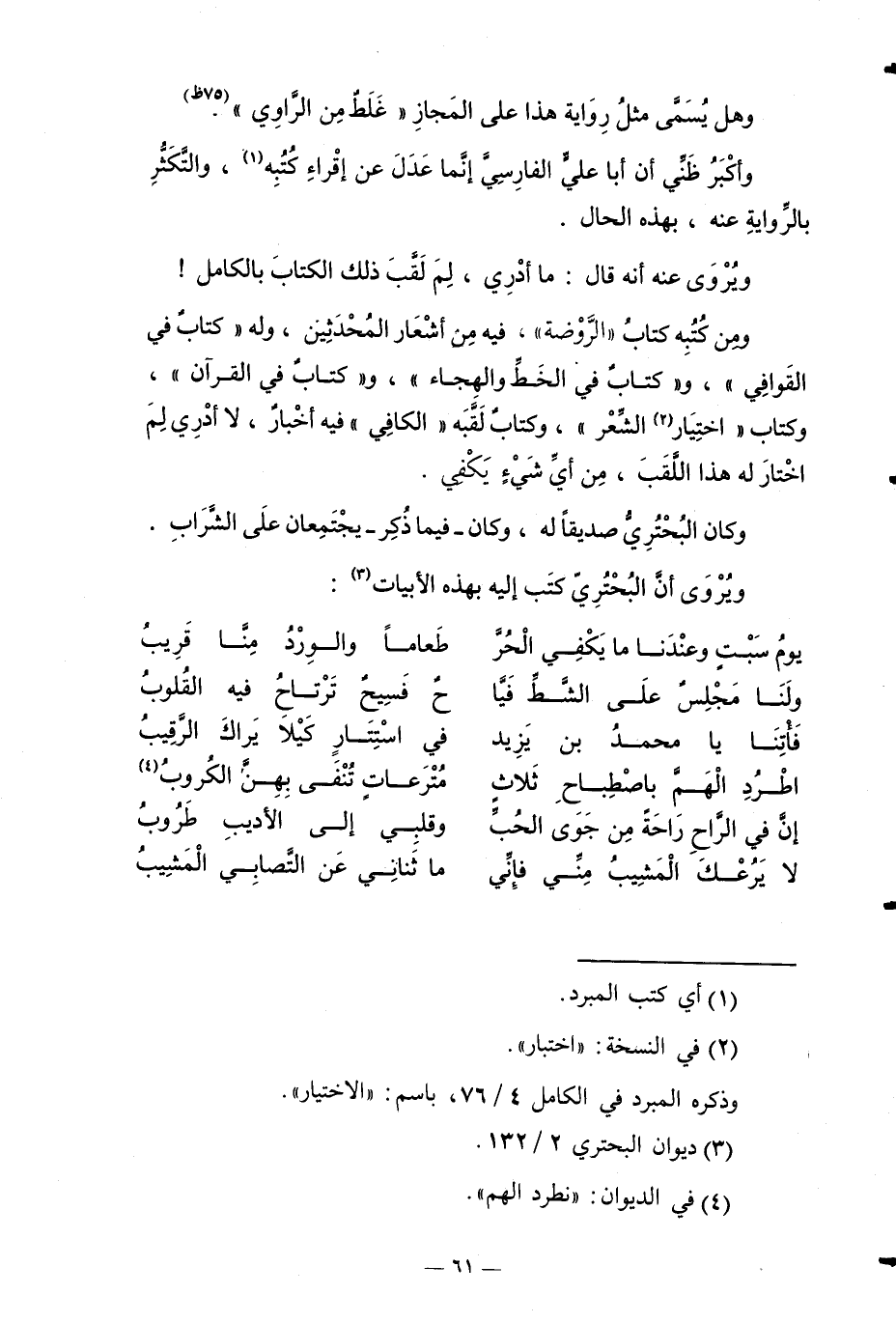 وَمن كتبه كتاب " الرَّوْضَة "، فِي من أشعار النحدثين، وَله " كتاب فِي القوافي "، و " كتاب فِي الخطِّ والهجاء "، و " كتاب فِي الْقُرْآن "، وَكتاب " اخْتِيَار الشّعْر "، وَكتاب لقبه " الْكَافِي " فِيهِ أخبارٌ، لَا أَدْرِي لِمَ اخْتَار لَهُ هَذَا اللقب، من أَي شَيْء يَكْفِي؟.