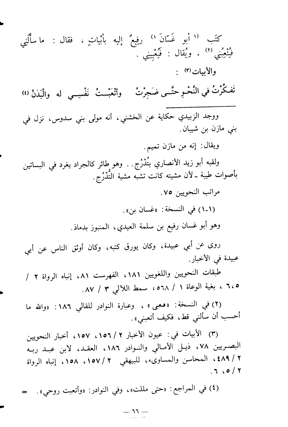 كتب أَبُو غَسَّان رَفيع إِلَيْهِ بِأَبْيَات، فَقَالَ: مَا سَأَلَني فيتعبني، وَيُقَال: فيعييني.