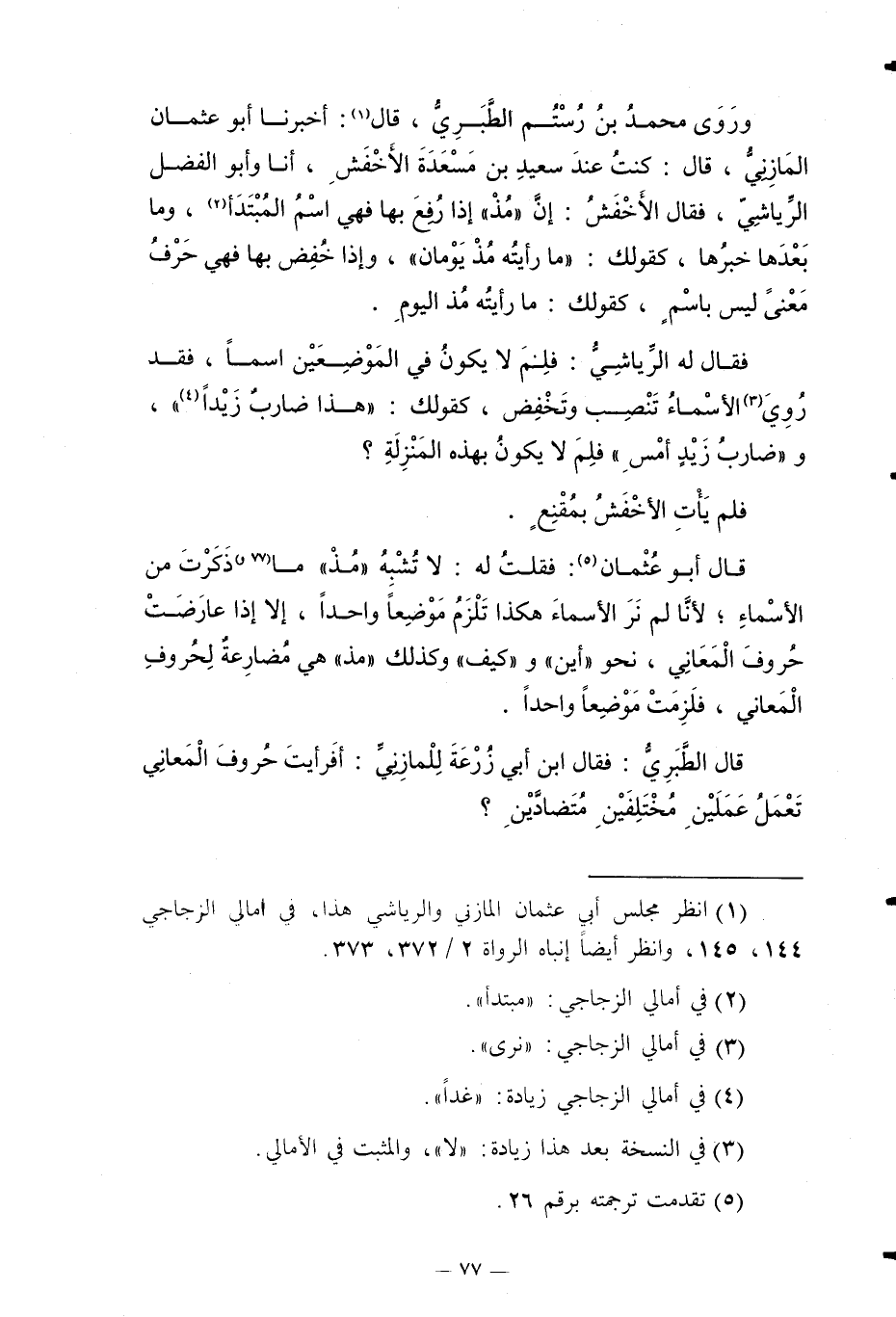 وروى مُحَمَّد بن رستم الطَّبَرِيّ، قَالَ: أخبرنَا أَبُو عُثْمَان الْمَازِني، قَالَ: كنت عِنْد سعيد بن مسْعدَة الْأَخْفَش، أَنا وَأَبُو الْفضل الرياشي، فَقَالَ الْأَخْفَش: إِن " مذ " إِذا رفع بهَا فَهِيَ اسْم الْمُبْتَدَأ، وَمَا بعْدهَا خَبَرهَا، كَقَوْلِك: " مَا رَأَيْته مذ يَوْمَانِ "، وَإِذا خُفض بهَا فَهِيَ حرف معنى لَيْسَ باسم، كَقَوْلِك: مَا رَأَيْته مذ الْيَوْم.