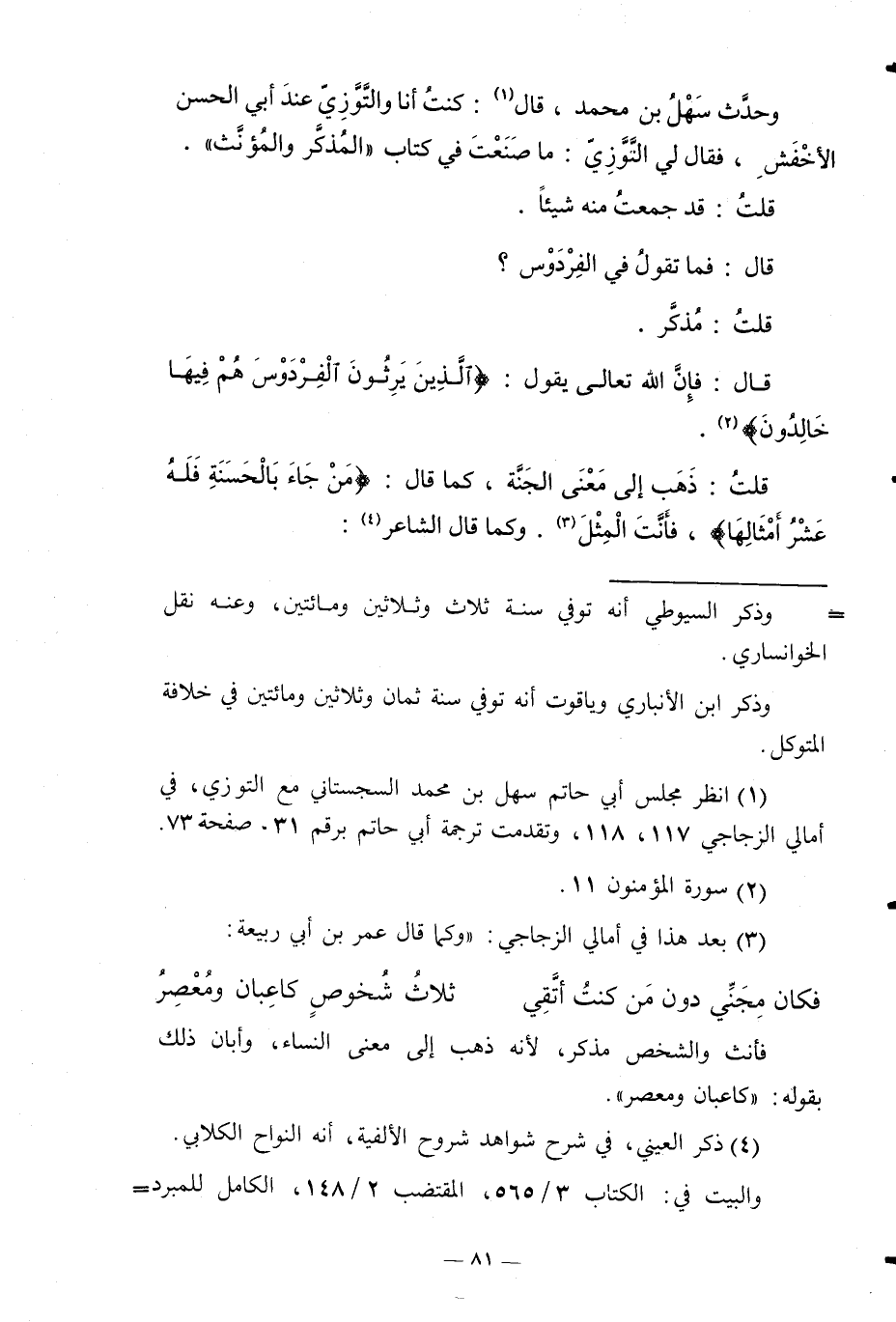 وحدَّث سهل بن مُحَمَّد، قَالَ: كنت أَنا والتوزي عِنْد أبي الْحسن الْأَخْفَش، فَقَالَ لي التوزي: مَا صنعت فِي كتاب " الْمُذكر والمؤنث ".