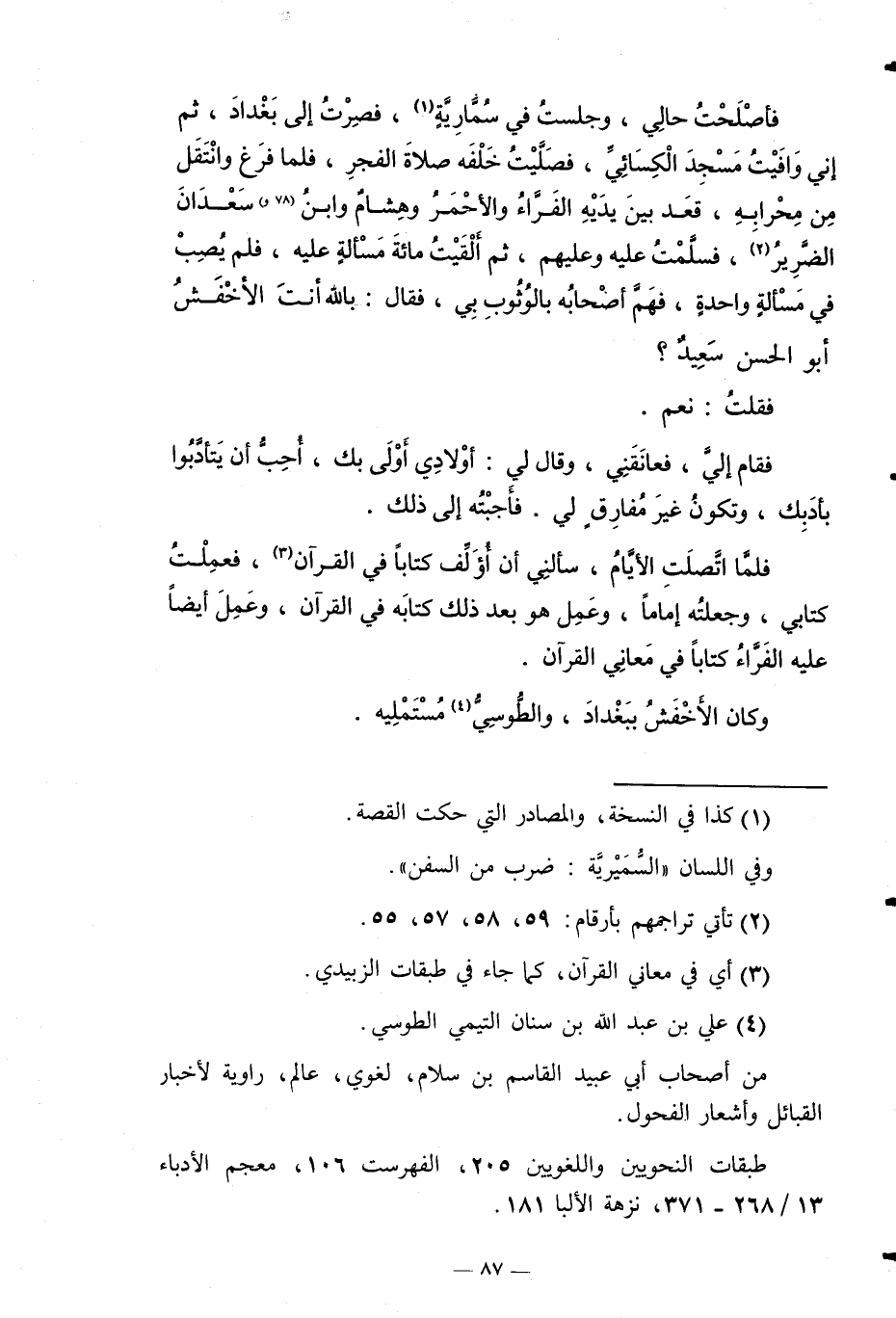 فأصلحت حَالي، وَجَلَست فِي سمارية، (1) فصرت إِلَى بَغْدَاد، ثمَّ إِنِّي وافيت مَسْجِد الْكسَائي، فَصليت خَلفه صَلَاة الْفجْر، فَلَمَّا فرغ وانتقل من محرابه، قعد بَين يَدَيْهِ الْفراء والأحمر وَهِشَام وَابْن سَعْدَان الضَّرِير، فسلَّمت عَلَيْهِ وَعَلَيْهِم، ثمَّ ألقيت مائَة مَسْأَلَة عَلَيْهِ، فَلم يصبْ فِي مَسْأَلَة وَاحِدَة، فهمَّ أَصْحَابه بالوثوب ي، فَقَالَ: بِاللَّه أَنْت الْأَخْفَش أَبُو الْحسن سعيد؟