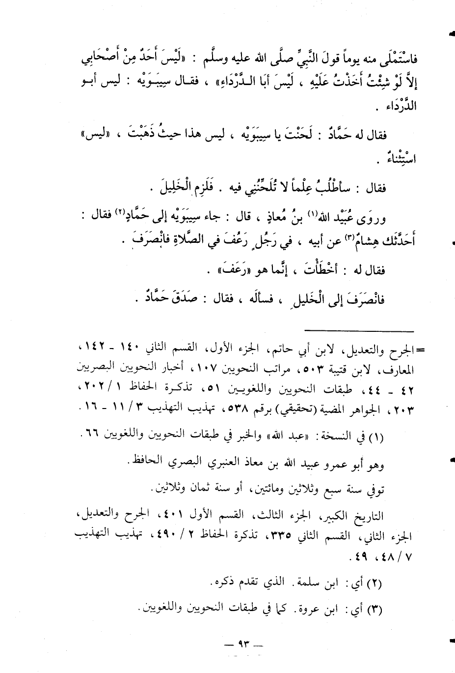 وروى عبيد الله بن معَاذ، قَالَ: جَاءَ سِيبَوَيْهٍ إِلَى حَمَّاد فَقَالَ: أحدثَّك هِشَام عَن أَبِيه، فِي رجل رعُف فِي الصَّلَاة فَانْصَرف.