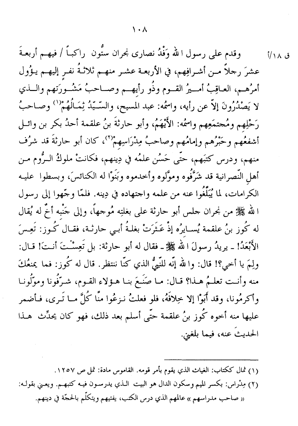 وقدم عَلَى رَسُولِ اللهِ صَلَّى اللَّهُ عَلَيْهِ وَسَلَّمَ وفد نصارى نجران ستون راكبا، فيهم أربعة عشر من أشرافهم، فِي الأربعة عشر منهم ثلاثة نفر إليهم يؤول أمرهم، العاقب أمير الْقَوْم، وذو رأيهم، وصاحب مشورتهم، وَالَّذِي لا يصدرون إِلا عَنْ رأيه، واسمه عَبْد المسيح، والسيد ثمالهم، وصاحب رحلهم مجتمعهم واسمه الأيهم، وأبو حارثه بْن علقمة أحد بكر بْن وائل أشفعهم وحبرهم، وإمامهم، وصاحب مدارسهم كَانَ أبو حارثة قَدْ شرف منهم، ودرس كتبهم حَتَّى حسن علمه فِي دينهم، فكانت ملوك الروم مِنْ أَهْلِ النصرانية قَدْ شرفوه، ومولوه، وأخدموه، وبنوا لَهُ