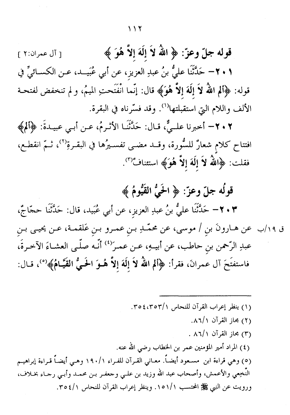 202 - أَخْبَرَنَا علي، قَالَ: حَدَّثَنَا الأثرم، عَنْ أبي عبيدة: {الم} ، افتتاح كَلام شعار للسورة، وقد مضى تفسيرها فِي البقرة، ثُمَّ انقطع، فقلت: {اللهُ لا إِلَهَ إِلا هُوَ} : استئناف قوله جَلَّ وَعَزَّ: {الْحَيُّ الْقَيُّومُ}
