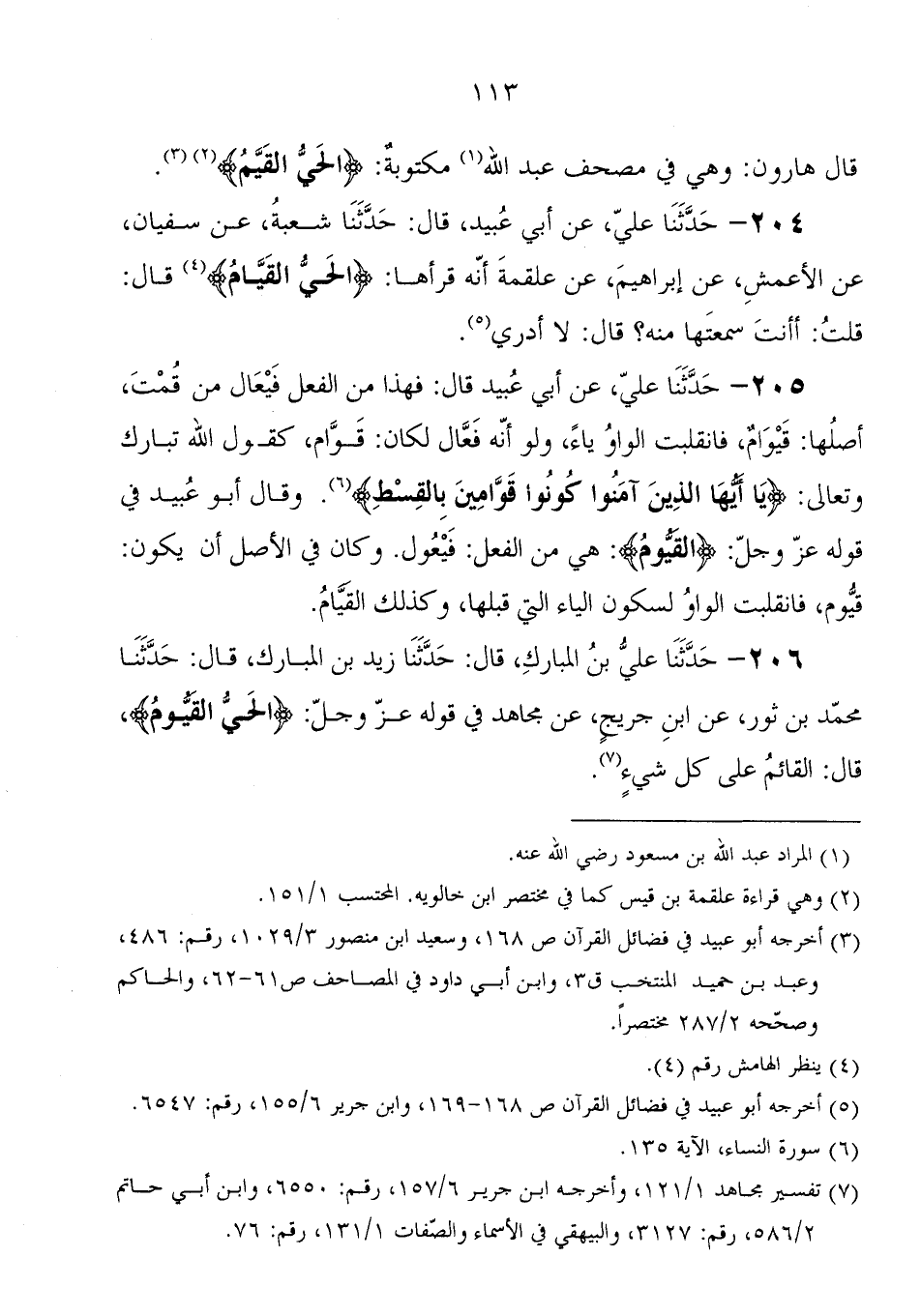 204 - حَدَّثَنَا علي، عَنْ أبي عبيد، قَالَ: حَدَّثَنَا شعبة، عَنْ سفيان، عَنْ الأعمش عَنْ إِبْرَاهِيم عَنْ علقمة، " أَنَّهُ قرأها " الحي القيام "، قَالَ: قلت: أأنت سمعتها مِنْهُ؟ قَالَ: لا أدري