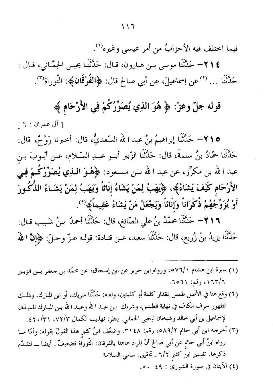 215 - حَدَّثَنَا إِبْرَاهِيمُ بْنُ عَبْدِ اللهِ السَّعْدِيُّ، قَالَ: أَخْبَرَنَا رَوْحٌ، قَالَ: حَدَّثَنَا حَمَّادُ بْنُ سَلَمَةَ، قَالَ: حَدَّثَنَا الزُّبَيْرُ أَبُو عَبْدِ السَّلامِ، عَنْ أَيُّوبَ بْنِ عَبْدِ اللهِ بْنِ مُكَرَّزٍ، عَنْ عَبْدِ اللهِ بْنِ مَسْعُودٍ: " {هُوَ الَّذِي يُصَوِّرُكُمْ فِي الأَرْحَامِ كَيْفَ يَشَاءُ} ، {يَهَبُ لِمَنْ يَشَاءُ إِنَاثًا وَيَهَبُ لِمَنْ يَشَاءُ الذُّكُورَ أَوْ يُزَوِّجُهُمْ ذُكْرَانًا وَإِنَاثًا وَيَجْعَلُ مَنْ يَشَاءُ عَقِيمًا} "