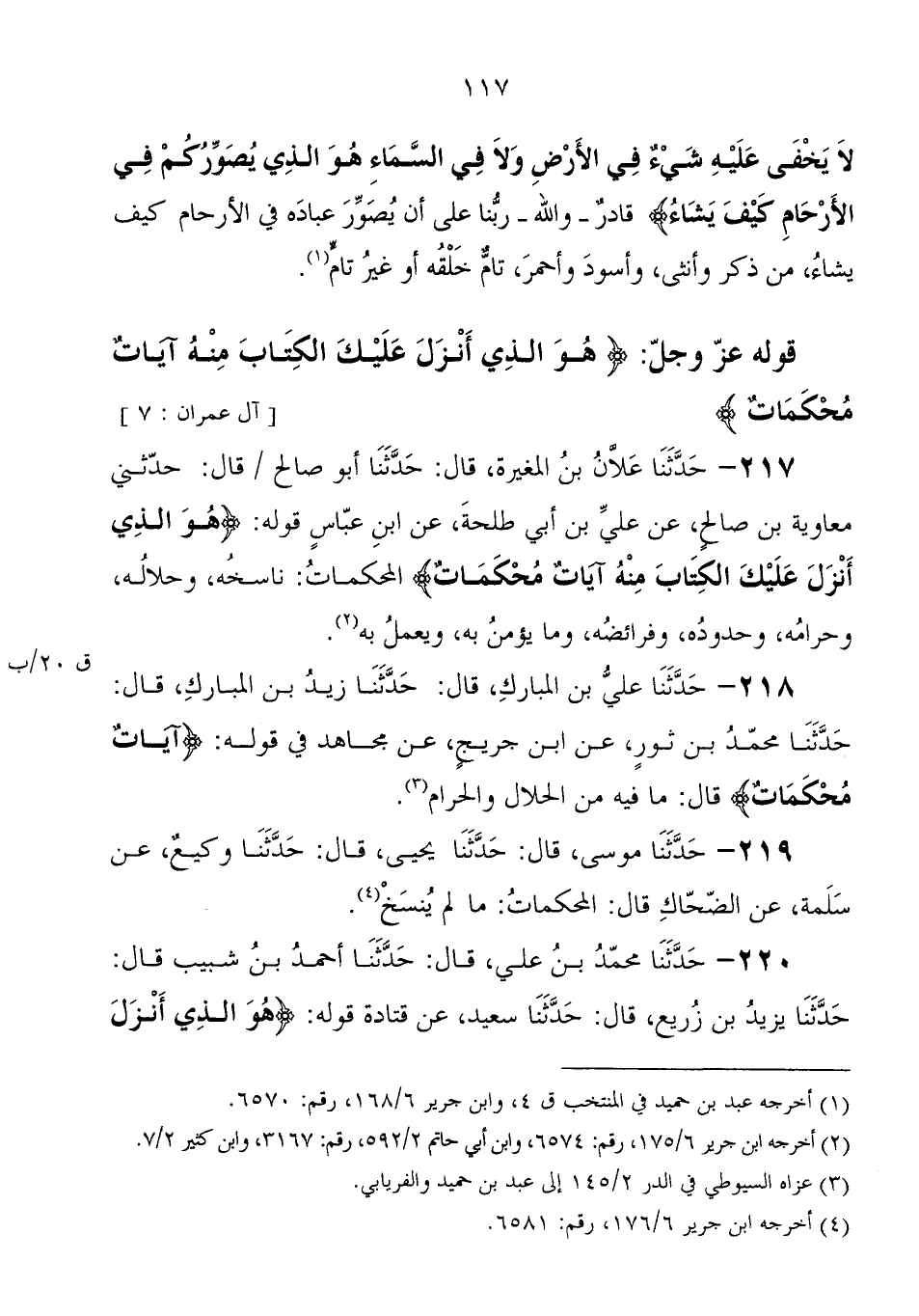 217 - حَدَّثَنَا عَلانُ بْنُ الْمُغِيرَةِِ، قَالَ: حَدَّثَنَا أَبُو صَالِحٍ، قَالَ: حَدَّثَنِي مُعَاوِيَةُ بْنُ صَالِحٍ، عَنْ عَلِيِّ بْنِ أَبِي طَلْحَةَ، عَنِ ابْنِ عَبَّاسٍ، قوله: " {هُوَ الَّذِي أَنْزَلَ عَلَيْكَ الْكِتَابَ مِنْهُ آيَاتٌ مُحْكَمَاتٌ} ، الْمُحْكَمَاتُ نَاسِخَةٌ، وَحَلالُهُ، وَحَرَامُهُ، وَحُدُودُهُ، وَفَرَائِضُهُ، وَمَا يُؤْمَنُ بِهِ وَيُعْمَلُ بِهِ "