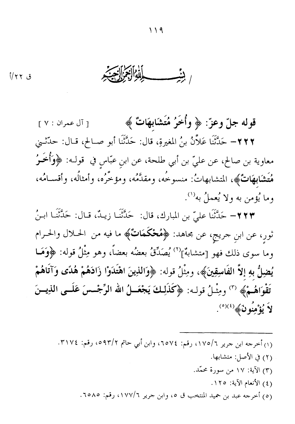 222 - حَدَّثَنَا عَلانُ بْنُ الْمُغِيرَةِِ، قَالَ: حَدَّثَنَا أَبُو صَالِحٍ، قَالَ: حَدَّثَنِي مُعَاوِيَةُ بْنُ صَالِحٍ، عَنْ عَلِيِّ بْنِ أَبِي طَلْحَةَ، عَنِ ابْنِ عَبَّاسٍ، فِي قوله: " {وَأُخَرُ مُتَشَابِهَاتٌ} ، الْمُتَشَابِهَاتُ: مَنْسُوخُهُ، وَمُقَدَّمُهُ، وَمُؤَخَّرُهُ، وَأَمْثَالُهُ، وَأَقْسَامُهُ، وَمَا يُؤْمَنُ بِهِ وَلا يُعْمَلُ بِهِ "