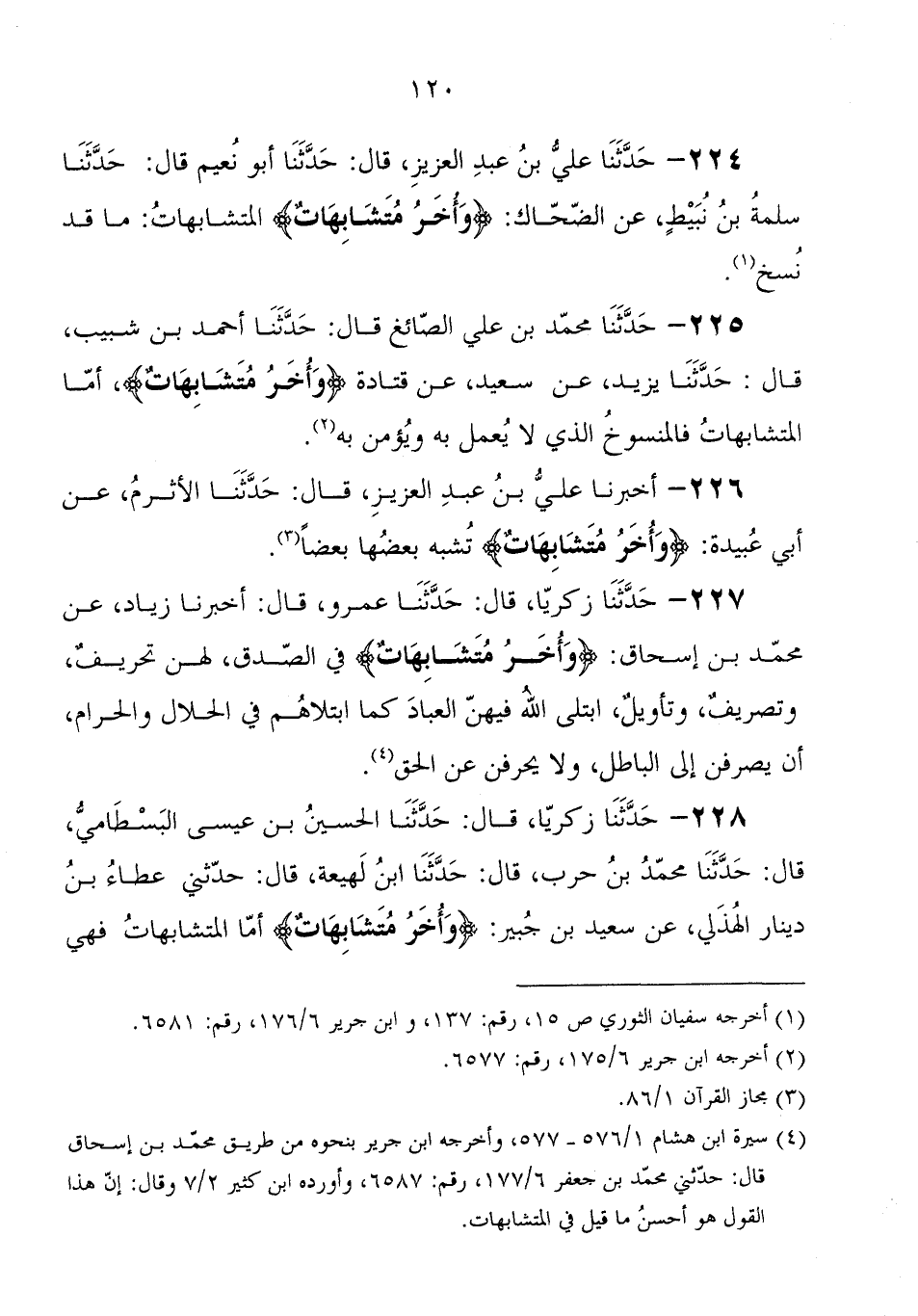 228 - حَدَّثَنَا زَكَرِيَّا، قَالَ: حَدَّثَنَا الحسين بْن عِيسَى البسطامي، قَالَ: حَدَّثَنَا محمد بْن حرب، قَالَ: حَدَّثَنَا ابْن لهيعة، قَالَ: حَدَّثَنِي عطاء بْن دينار الهذلي، عَنْ سعيد بْن جبير: {وَأُخَرُ مُتَشَابِهَاتٌ} " أما المتشابهات فهي