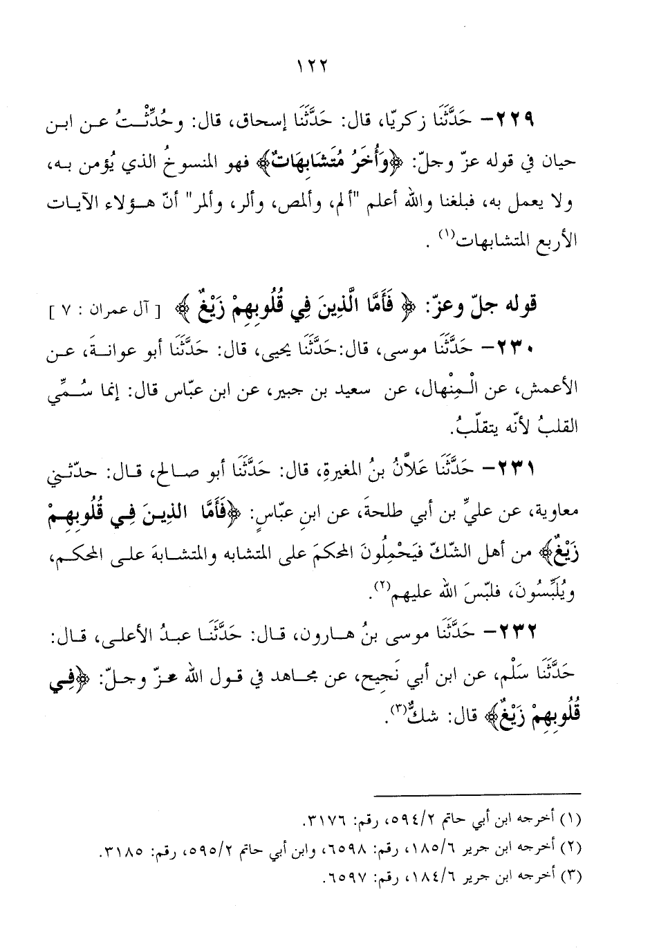 231 - حَدَّثَنَا عَلانُ بْنُ الْمُغِيرَةِِ، قَالَ: حَدَّثَنَا أَبُو صَالِحٍ، قَالَ: حَدَّثَنِي مُعَاوِيَةُ بْنُ صَالِحٍ، عَنْ عَلِيِّ بْنِ أَبِي طَلْحَةَ، عَنِ ابْنِ عَبَّاسٍ: " فَأَمَّا الَّذِينَ فِي قُلُوبِهِمْ زَيْغٌ، مِنْ أَهْلِ الشَّكِّ، فَيَحْمِلُونَ الْمُحْكَمَ عَلَى الْمُتَشَابِهِ، وَالْمُتَشَابِهَ عَلَى الْمُحْكَمِ، وَيُلْبِسُونَ، فَلَبَّسَ اللهُ عَلَيْهِمْ "