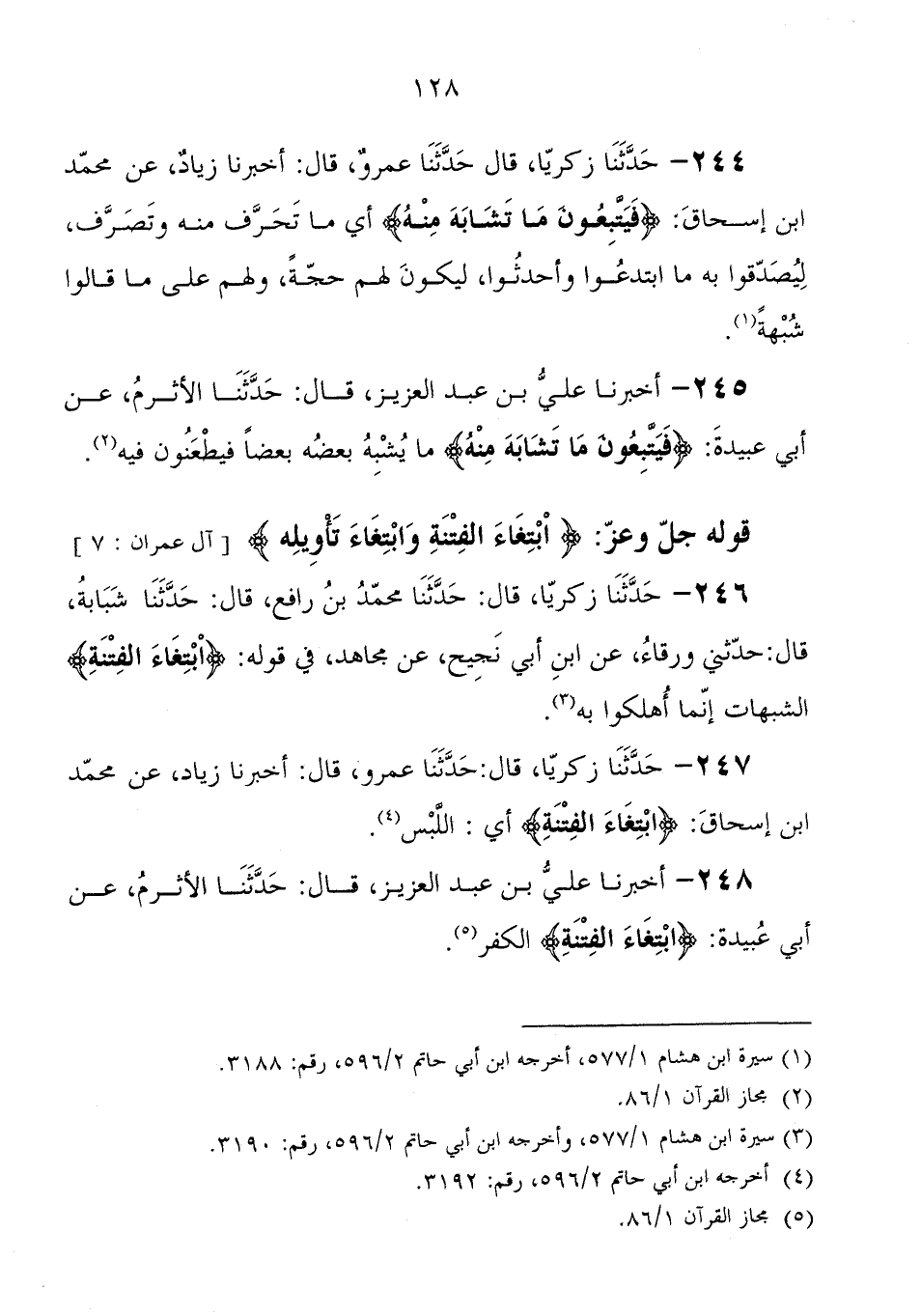 246 - حَدَّثَنَا زَكَرِيَّا، قَالَ: حَدَّثَنَا محمد بْن رافع، قَالَ: حَدَّثَنَا شبابة، قَالَ: حَدَّثَنِي ورقاء، عَنْ ابْن أبي نجيح، عَنْ مجاهد فِي قوله: {ابْتِغَاءَ الْفِتْنَةِ} " الشبهات إِنَّمَا أهلكوا بِهِ "