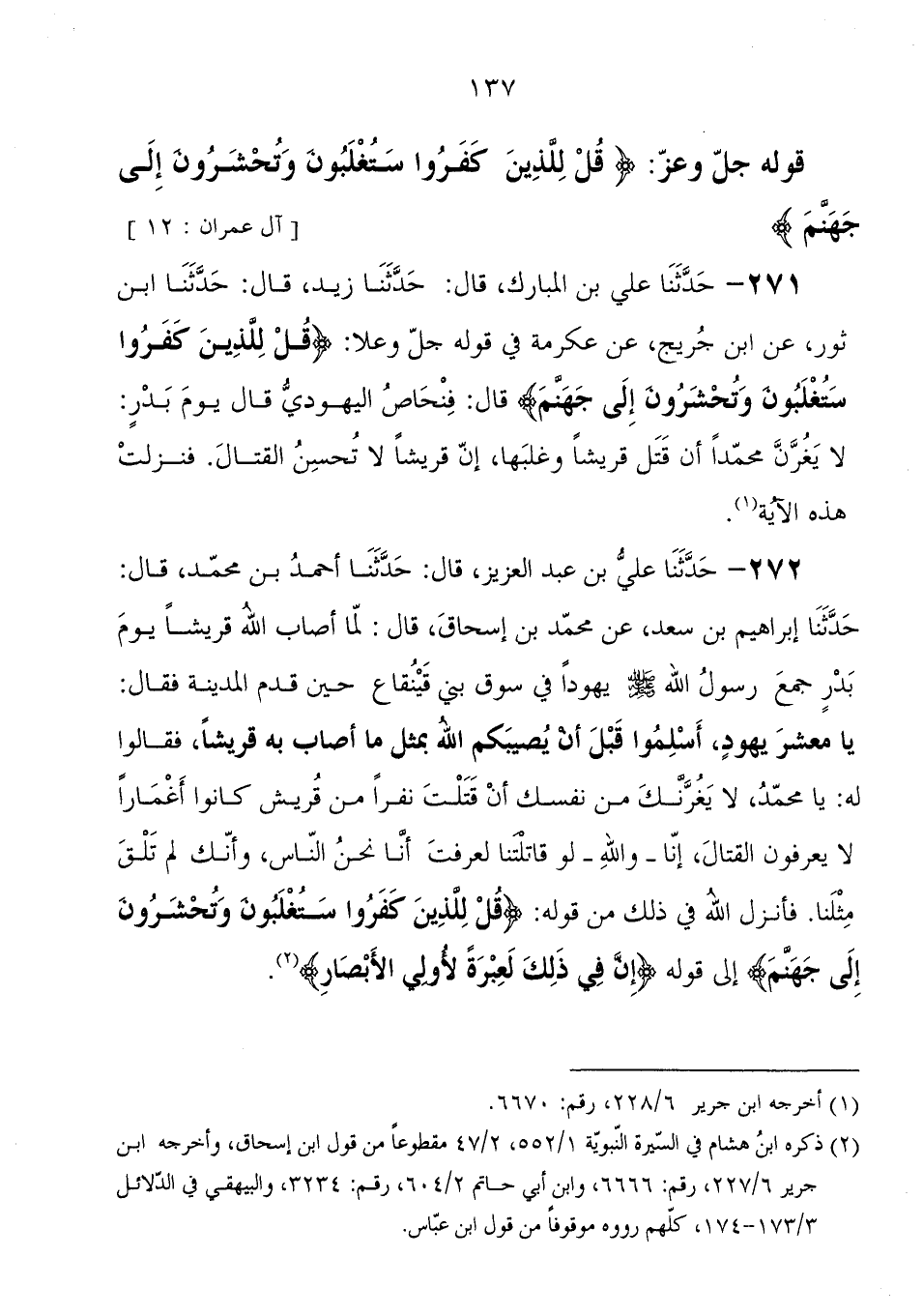 272 - حَدَّثَنَا عَلِيُّ بْنُ عَبْدِ الْعَزِيزِ، قَالَ: حَدَّثَنَا أَحْمَدُ بْنُ مُحَمَّدٍ، قَالَ: حَدَّثَنَا إِبْرَاهِيمُ بْنُ سَعْدٍ، عَنْ مُحَمَّدِ بْنِ إِسْحَاقَ، قَالَ: " لَمَّا أَصَابَ اللهُ قُرَيْشًا يَوْمَ بَدْرٍ جَمَعَ رَسُولُ اللهِ صَلَّى اللَّهُ عَلَيْهِ وَسَلَّمَ يَهُودًا فِي سُوقِ بَنِي قَيْنُقَاعٍ حِينَ قَدِمَ الْمَدِينَةَ، فَقَالَ: يَا مَعْشَرَ يَهُودٍ، أَسْلِمُوا قَبْلَ أَنْ يُصِيبَكُمُ اللهُ بِمِثْلِ مَا أَصَابَ بِهِ قُرَيْشًا، فَقَالُوا لَهُ: يَا مُحَمَّدُ، لا يَغُرَّنَّكَ مِنْ نَفْسِكَ أَنْ قَتَلْتَ نَفَرًا مِنْ قُرَيْشً كَانُوا أَغْمَارًا لا يَعْرِفُونَ الْقِتَالَ، إِنَّا وَاللهِ لَوْ قَاتَلْتَنَا لَعَرَفْتَ أَنَّا نَحْنُ النَّاسُ، وَأَنَّكَ لَمْ تَلْقَ مِثْلَنَا، فَأَنْزَلَ اللهُ فِي ذَلِكَ مِنْ قوله: {قُلْ لِلَّذِينَ كَفَرُوا سَتُغْلَبُونَ وَتُحْشَرُونَ إِلَى جَهَنَّمَ إِلَى قوله: إِنَّ فِي ذَلِكَ لَعِبْرَةً لأُولِي الأَبْصَارِ} "