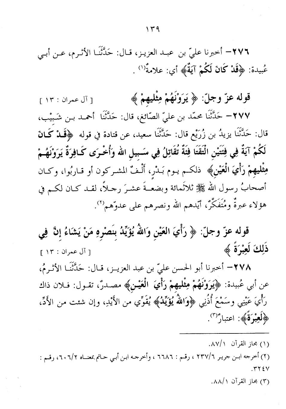 277 - حَدَّثَنَا محمد بْن علي الصائغ، قَالَ: حَدَّثَنَا أحمد بْن شبيب، قَالَ: حَدَّثَنَا يزيد بْن زريع، قَالَ: حَدَّثَنَا سعيد، عَنْ قتادة، فِي قوله: {قَدْ كَانَ لَكُمْ آيَةٌ فِي فِئَتَيْنِ الْتَقَتَا فِئَةٌ تُقَاتِلُ فِي سَبِيلِ اللهِ وَأُخْرَى كَافِرَةٌ يَرَوْنَهُمْ مِثْلَيْهِمْ رَأْيَ الْعَيْنِ} " ذلكم يَوْم بدر، ألف المشركون أَوْ قاربوا وَكَانَ أصحاب رَسُول اللهِ صَلَّى اللَّهُ عَلَيْهِ وَسَلَّمَ ثلاثمائة وبضعة عشر رجلا لقد كَانَ لَكُمْ فِي هؤلاء عبرة ومتفكر، أيدهم الله ونصرهم عَلَى عدوهم