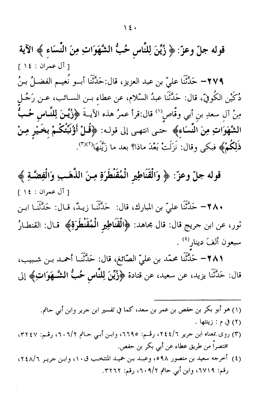 280 - حَدَّثَنَا علي بْن المبارك، قَالَ: حَدَّثَنَا زيد، قَالَ: حَدَّثَنَا ابْن ثور، عَنْ ابْن جريج، قَالَ: قَالَ مجاهد: {وَالْقَنَاطِيرِ الْمُقَنْطَرَةِ} قَالَ " القنطار سبعون ألف دينار
