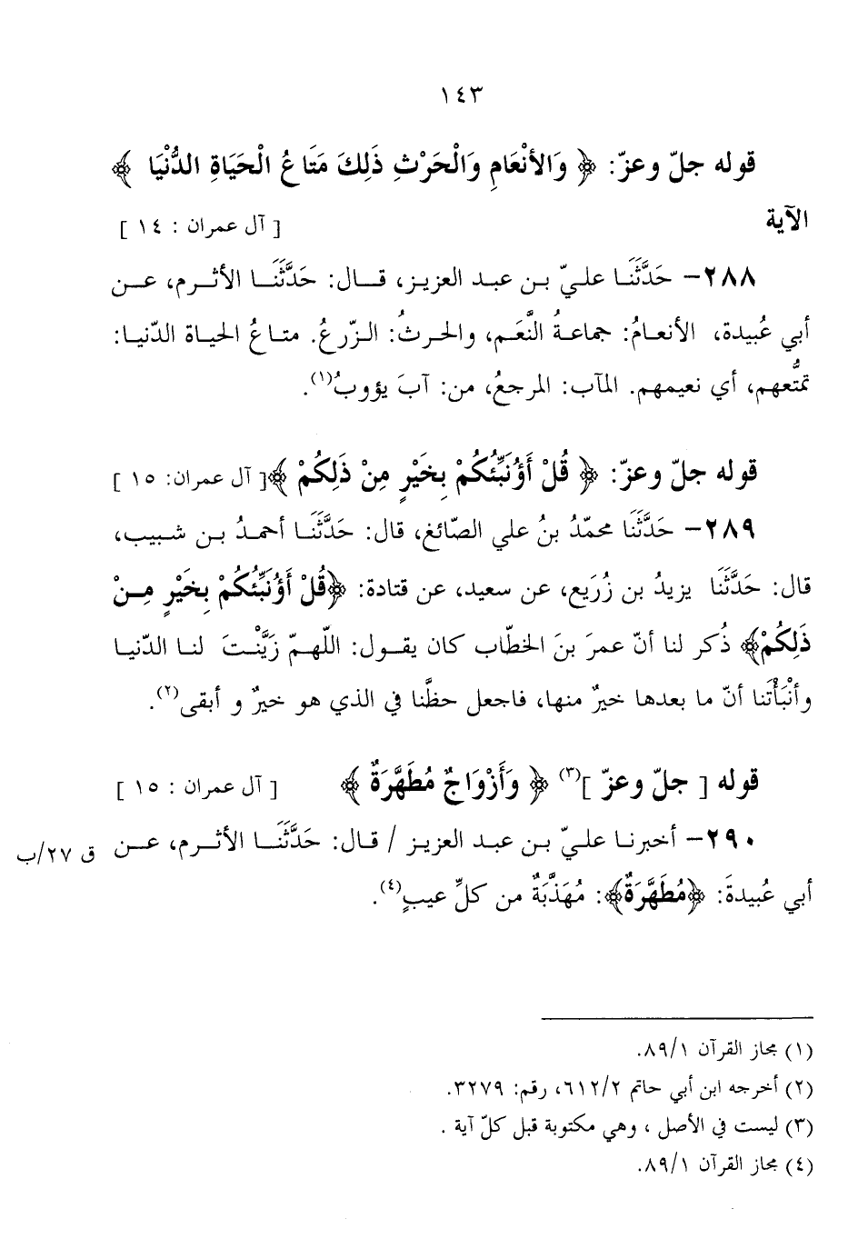 288 - حَدَّثَنَا علي بْن عَبْد العزيز، قَالَ: حَدَّثَنَا الأثرم، عَنْ أبي عبيدة، الأنعام: جماعة النعم، والحرث: الزرع، متاع الحياة الدنيا تمتعهم، أي: نعيمهم المآب المرجع، من آب يؤوب