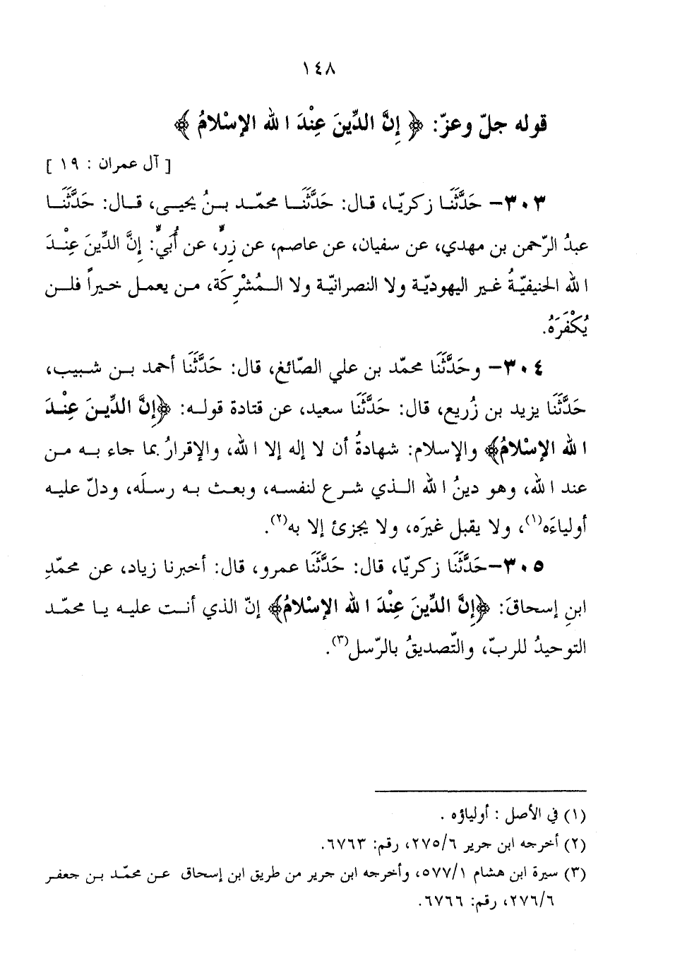 305 - حَدَّثَنَا زَكَرِيَّا، قَالَ: حَدَّثَنَا عمرو قَالَ: أَخْبَرَنَا زياد، عَنْ محمد بْن إسحاق: {إِنَّ الدِّينَ عِنْدَ اللهِ الإِسْلامُ} " إن الَّذِي أنت عَلَيْهِ يَا محمد التوحيد للرب، والتصديق بالرسل