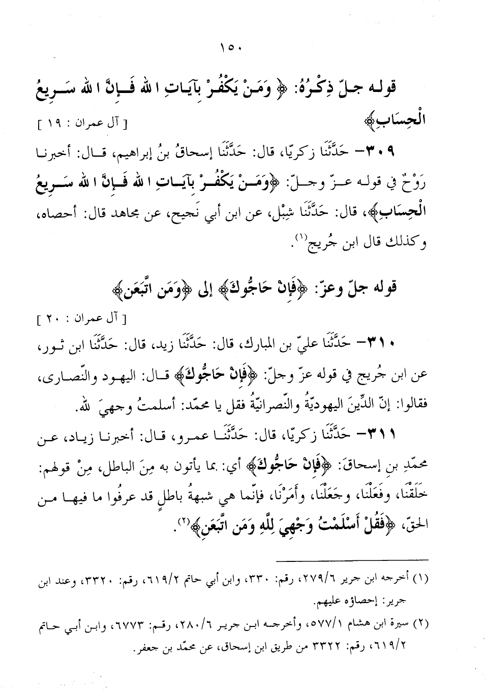 311 - حَدَّثَنَا زَكَرِيَّا، قَالَ: حَدَّثَنَا عمرو، قَالَ: أَخْبَرَنَا زياد، عَنْ محمد بْن إِسْحَاق {فَإِنْ حَاجُّوكَ} أي " بما يأتون بِهِ من الباطل من قولهم: خلقنا وفعلنا، وجعلنا، وأمرنا، فإنما هي شبهة باطل قَدْ عرفوا مَا فِيهَا من الحق، {فَقُلْ أَسْلَمْتُ وَجْهِيَ لِلَّهِ وَمَنِ اتَّبَعَنِ}