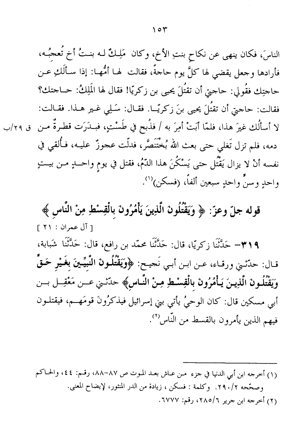319 - حَدَّثَنَا زَكَرِيَّا، قَالَ: حَدَّثَنَا محمد بْن رافع، قَالَ: حَدَّثَنَا شبابة، قَالَ: حَدَّثَنِي ورقاء، عَنْ ابْن أبي نجيح: {وَيَقْتُلُونَ الَّذِينَ يَأْمُرُونَ بِالْقِسْطِ مِنَ النَّاسِ} حَدَّثَنِي، عَنْ معقل بْن أبي مسكين، قَالَ " كَانَ الوحي يأتي بني إِسْرَائِيل، فيذكرون قومهم فيقتلون فيهم الذين يأمرون بالقسط مِنَ النَّاسِ