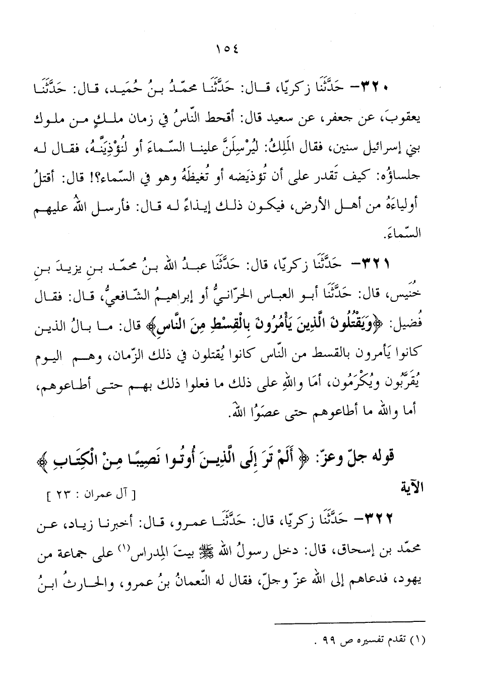 322 - حَدَّثَنَا زَكَرِيَّا، قَالَ: حَدَّثَنَا عَمْرٌو، قَالَ: أَخْبَرَنَا زِيَادٌ، عَنْ مُحَمَّدِ بْنِ إِسْحَاَقَ، قَالَ: " دَخَلَ رَسُولُ اللهِ صَلَّى اللَّهُ عَلَيْهِ وَسَلَّمَ بَيْتَ الْمَدَارِسِ عَلَى جَمَاعَةٍ مِنْ يَهُودَ، فَدَعَاهُمْ إِلَى اللهِ عَزَّ وَجَلَّ، فَقَالَ لَهُ النُّعْمَانُ بْنُ عَمْرٍو، وَالْحَارِثُ بْنُ