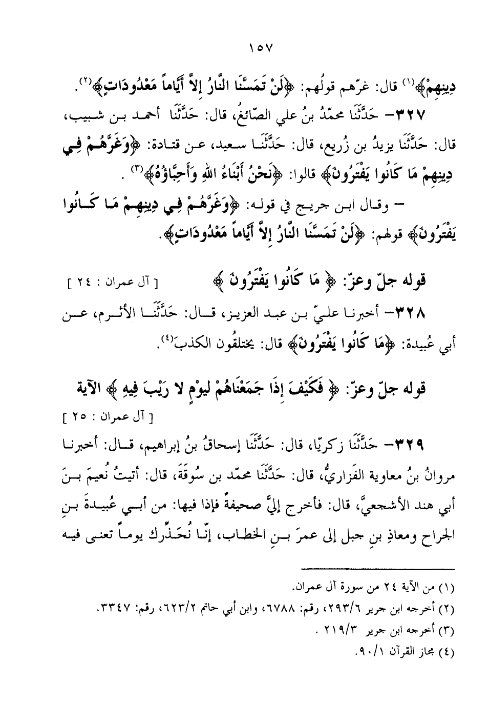 327 - حَدَّثَنَا محمد بْن علي الصائغ، قَالَ: حَدَّثَنَا أحمد بْن شبيب، قَالَ: حَدَّثَنَا يزيد بْن زريع، قَالَ: حَدَّثَنَا سعيد، عَنْ قتادة: {وَغَرَّهُمْ فِي دِينِهِمْ مَا كَانُوا يَفْتَرُونَ} قَالُوا: {نَحْنُ أَبْنَاءُ اللهِ وَأَحِبَّاؤُهُ} وَقَالَ ابْن جريج فِي قوله: {وَغَرَّهُمْ فِي دِينِهِمْ مَا كَانُوا يَفْتَرُونَ} قولهم: {لَنْ تَمَسَّنَا النَّارُ إِلا أَيَّامًا مَعْدُودَاتٍ}