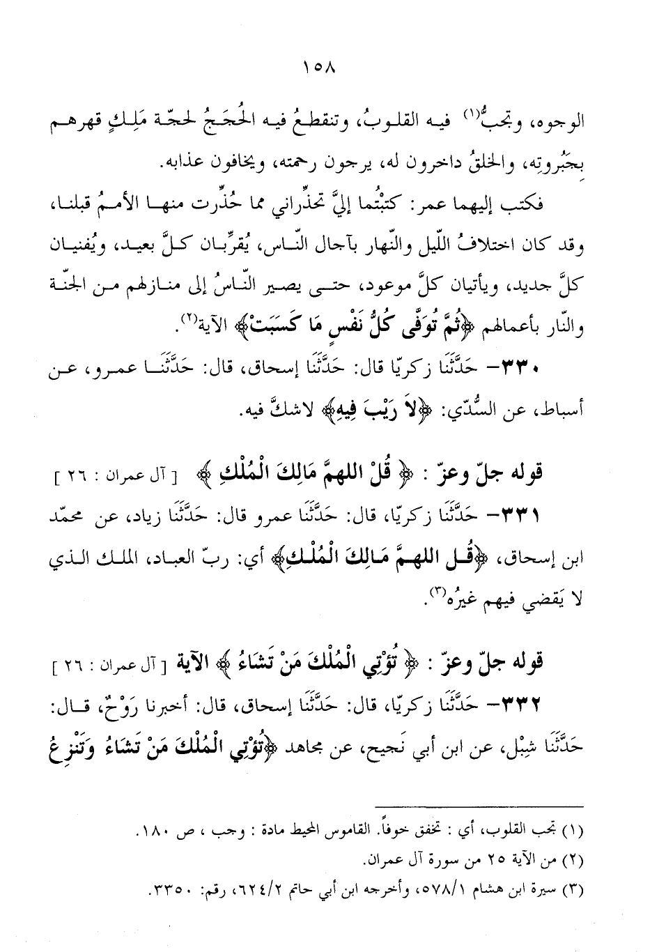 331 - حَدَّثَنَا زَكَرِيَّا، قَالَ: حَدَّثَنَا عمرو، قَالَ: حَدَّثَنَا زياد، عَنْ محمد بْن إِسْحَاق: {قُلِ اللهُمَّ مَالِكَ الْمُلْكِ} أي " رب العبادة الملك الَّذِي لا يقضي فيهم غيره