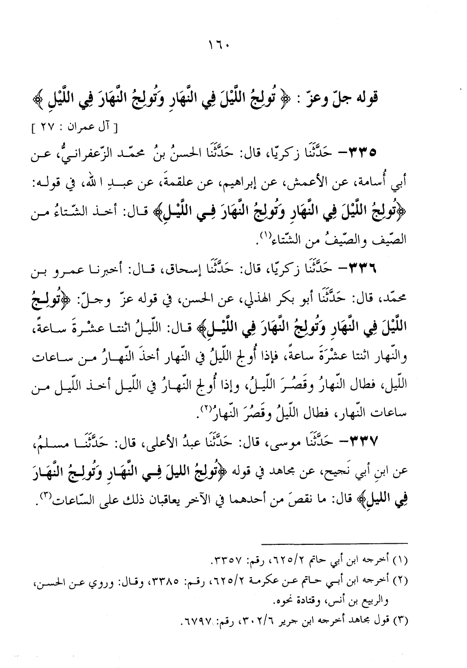 336 - حَدَّثَنَا زَكَرِيَّا، قَالَ: حَدَّثَنَا إِسْحَاق، قَالَ: أَخْبَرَنَا عمرو بْن محمد، قَالَ: حَدَّثَنَا أبو بكر الهذلي، عَنْ الحسن فِي قوله عَزَّ وَجَلَّ: {تُولِجُ اللَّيْلَ فِي النَّهَارِ وَتُولِجُ النَّهَارَ فِي اللَّيْلِ} قَالَ " اللَّيْل اثنتا عشرة ساعة، والنهار اثنتا عشرة ساعة، فَإِذَا أولج اللَّيْل فِي النَّهَار أخذ النَّهَار من ساعات اللَّيْل، فطال النَّهَار وقصر اللَّيْل، وإذا أولج النَّهَار فِي اللَّيْلِ أخذ اللَّيْل من ساعات النَّهَار فطال اللَّيْل، وقصر النَّهَار