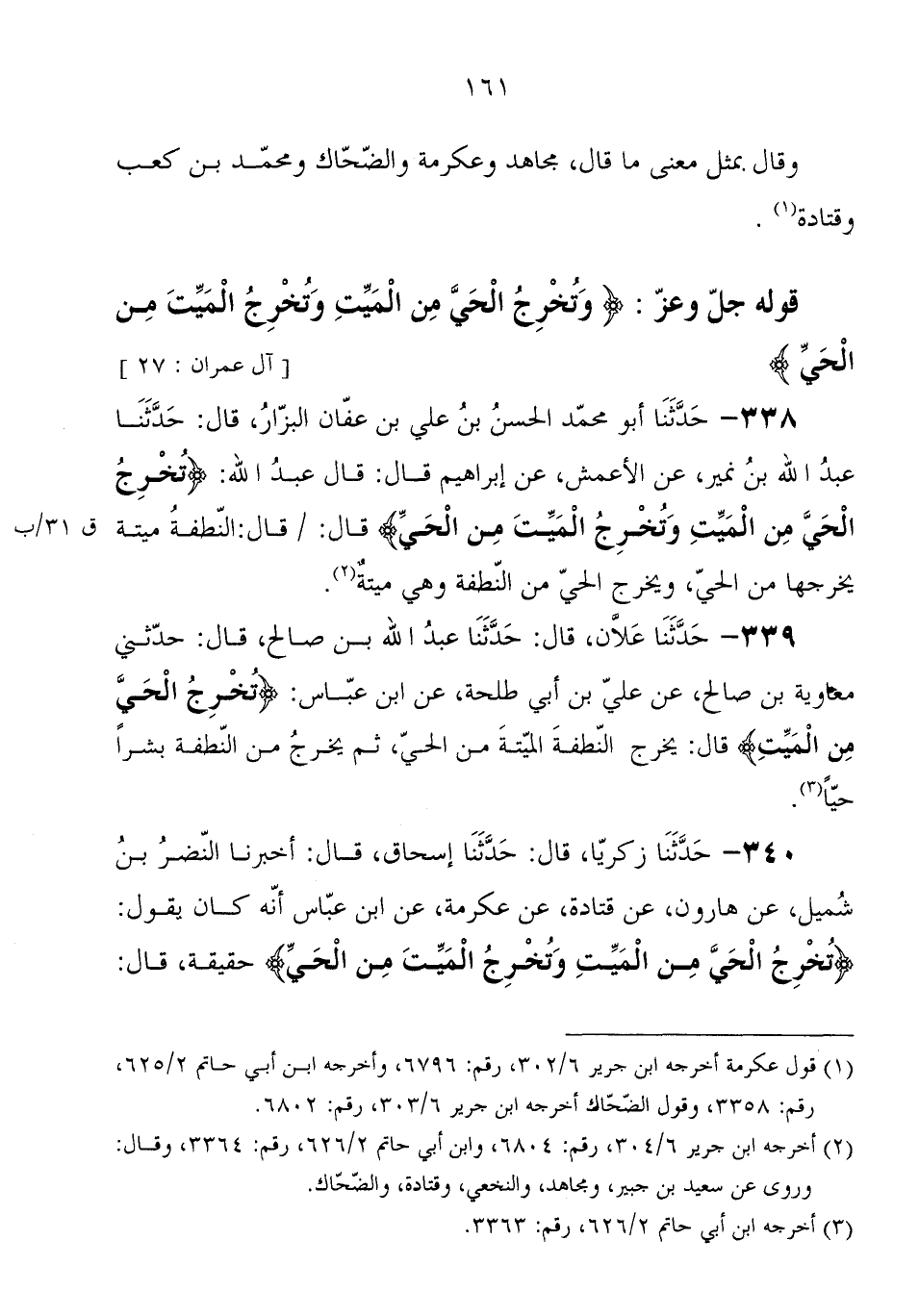 338 - حَدَّثَنَا أَبُو مُحَمَّدٍ الْحَسَنُ بْنُ عَلِيِّ بْنِ عَفَّانَ الْبَزَّارُ، قَالَ: حَدَّثَنَا عَبْدُ اللهِ بْنُ نُمَيْرٍ، عَنِ الأَعْمَشِ، عَنْ إِبْرَاهِيمَ، قَالَ عَبْدُ اللهِ: " {وَتُخْرِجُ الْحَيَّ مِنَ الْمَيِّتِ وَتُخْرِجُ الْمَيِّتَ مِنَ الْحَيِّ} ، قَالَ: قَالَ: النُّطْفَةُ مَيِّتَةٌ يُخْرِجُهَا مِنَ الْحَيِّ، وَيُخْرِجُ الْحَيَّ مِنَ النُّطْفَةِ وَهِيَ مَيِّتَةٌ "