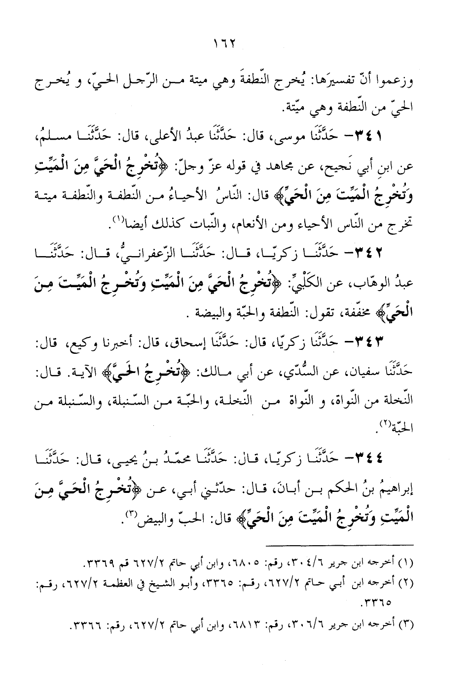 341 - حَدَّثَنَا موسى، قَالَ: حَدَّثَنَا عَبْد الأعلى، قَالَ: حَدَّثَنَا مسلم، عَنْ ابْن أبي نجيح، عَنْ مجاهد، فِي قوله عَزَّ وَجَلَّ: {وَتُخْرِجُ الْحَيَّ مِنَ الْمَيِّتِ وَتُخْرِجُ الْمَيِّتَ مِنَ الْحَيِّ} قَالَ " النَّاس الأحياء من النطفة، والنطفة ميتة تخرج مِنَ النَّاسِ الأحياء ومن