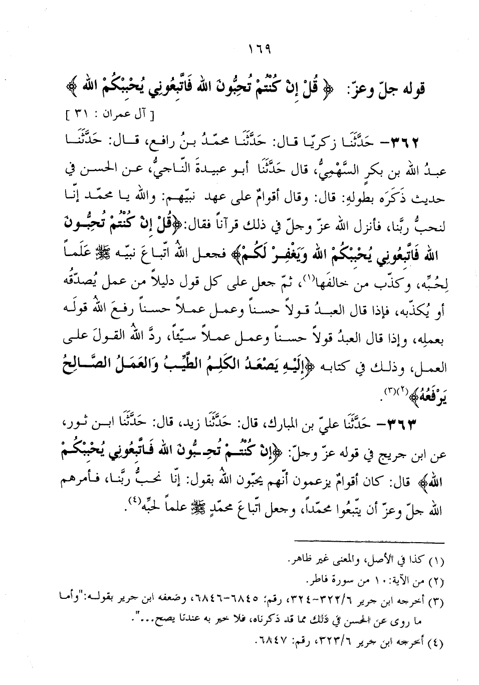 363 - حَدَّثَنَا علي بْن المبارك، قَالَ: حَدَّثَنَا زيد، قَالَ: حَدَّثَنَا محمد بْن ثور، عَنْ ابْن جريج قوله: {إِنْ كُنْتُمْ تُحِبُّونَ اللهَ فَاتَّبِعُونِي يُحْبِبْكُمُ اللهُ} قَالَ " كَانَ أقوام يزعمون أنهم يحبون الله بقول: إنا نحب ربنا، فأمرهم الله جَلَّ وَعَزَّ أن يتبعوا محمدا، وَجَعَلَ اتباع محمد صَلَّى اللَّهُ عَلَيْهِ وَسَلَّمَ علما لحبه