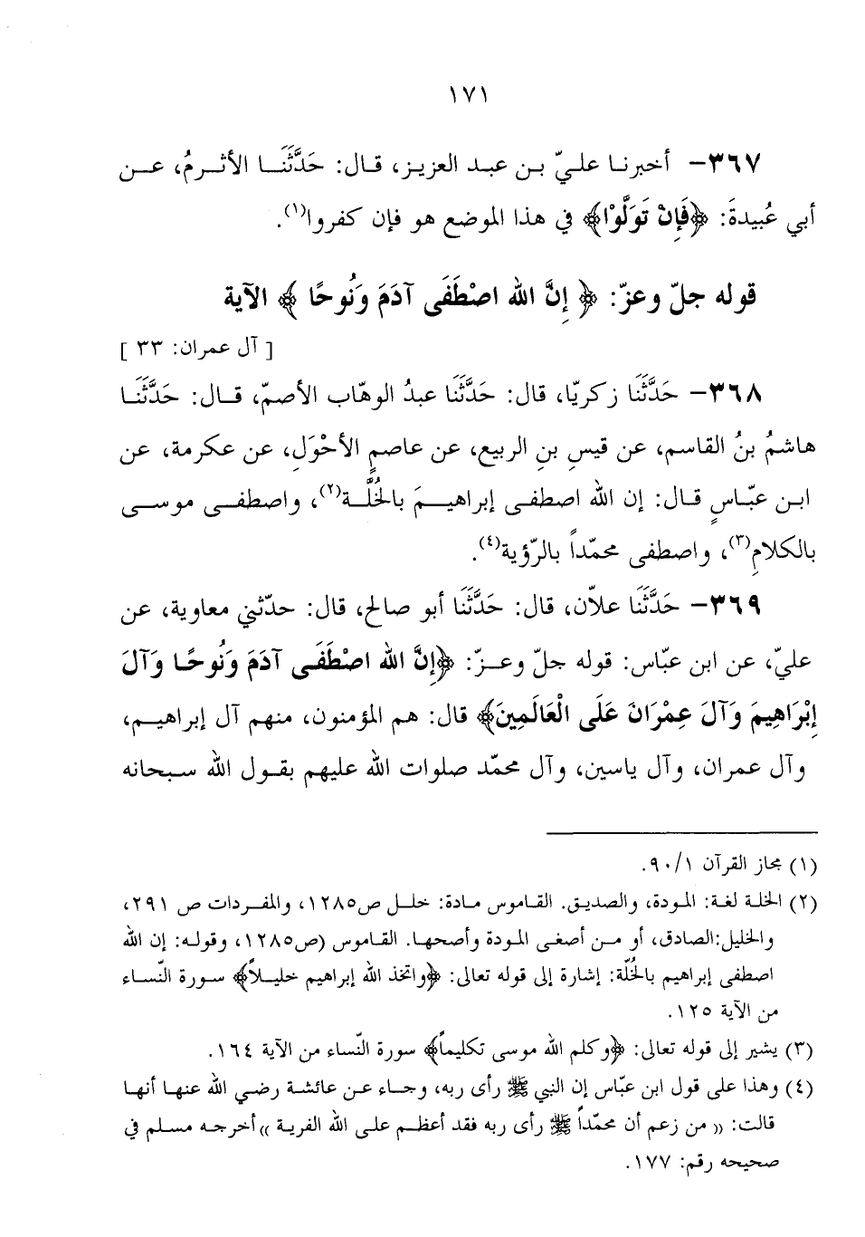 369 - حَدَّثَنَا عَلانُ بْنُ الْمُغِيرَةِ، قَالَ: حَدَّثَنَا أَبُو صَالِحٍ، قَالَ: حَدَّثَنِي مُعَاوِيَةُ، عَنْ عَلِيِّ بْنِ أَبِي طَلْحَةَ، عَنِ ابْنِ عَبَّاسٍ، قوله جَلَّ وَعَزَّ: " {إِنَّ اللهَ اصْطَفَى آدَمَ وَنُوحًا وَآلَ إِبْرَاهِيمَ وَآلَ عِمْرَانَ عَلَى الْعَالَمِينَ} ، قَالَ: هُمُ الْمُؤْمِنُونَ مِنْهُمْ آلُ إِبْرَاهِيمُ، وَآلُ عِمْرَانَ، وَآلُ يَاسِينَ، وَآلُ مُحَمَّدٍ صَلَوَاتُ اللهِ عَلَيْهِمْ بِقَوْلِ اللهِ سُبْحَانَهُ: